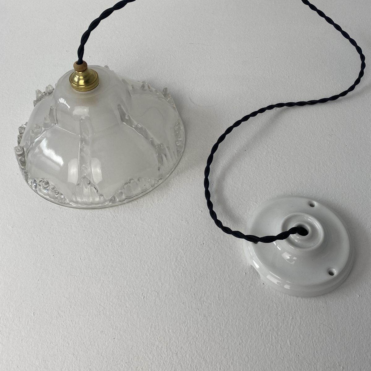L’électricité a été refaite. Douille à baïonnette en laiton (Ampoules B22). Branchement par domino. Fil noir en tissu tressé et rosace de fixation en porcelaine.