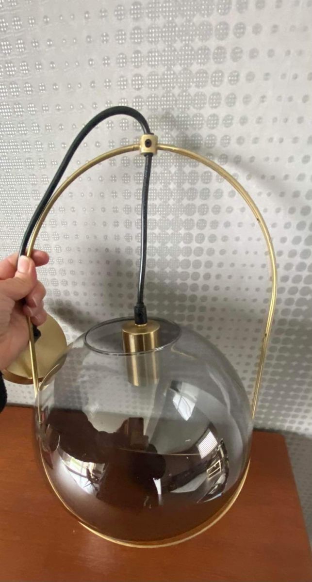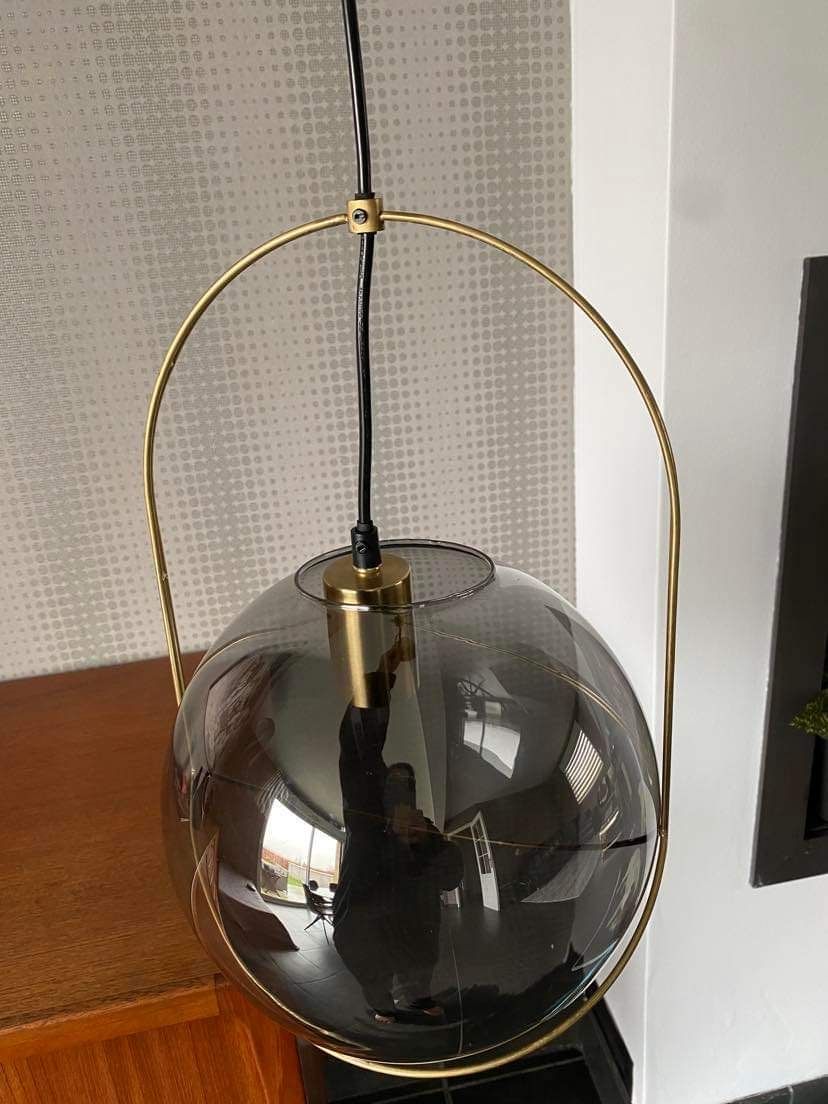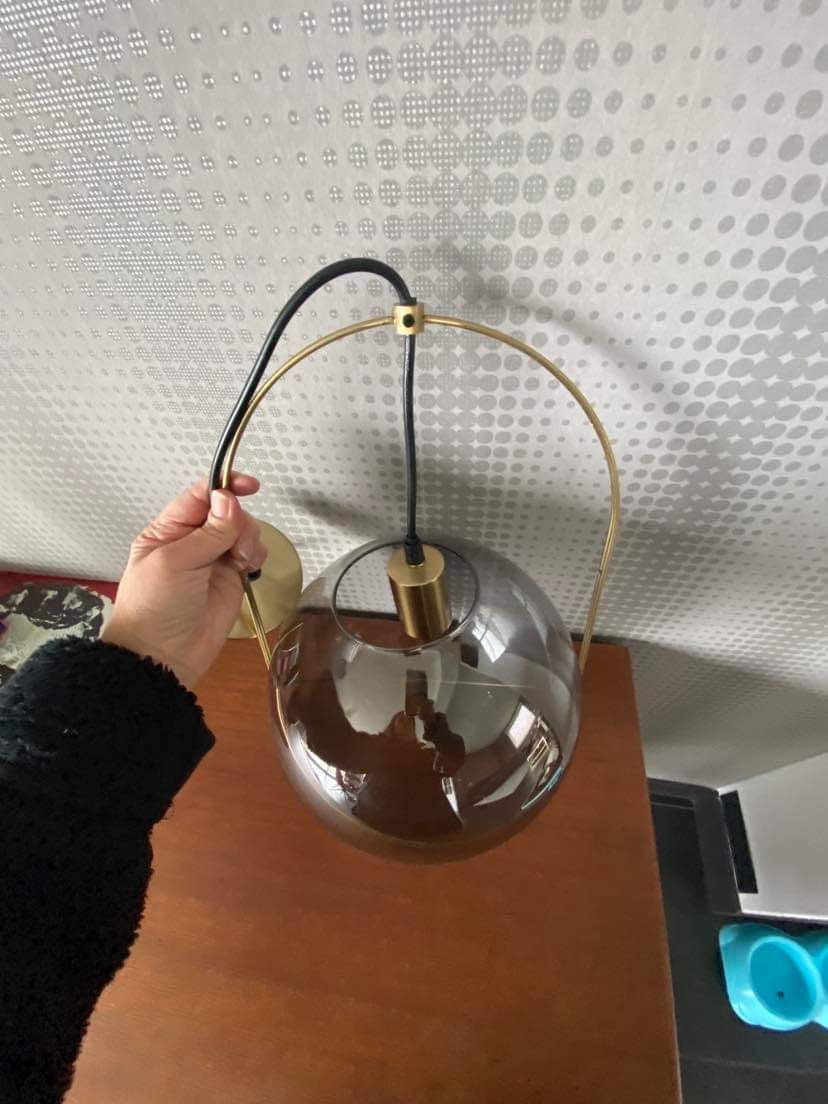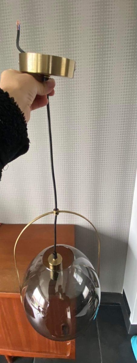 Suspension boule et métal doré effet vintage et contemporain à la fois en très bon état La boule en verre soufflé est à poser sur le support Fera un très bel effet dans votre intérieur qu’il soit moderne ou vintage Hauteur plafond 66 cm