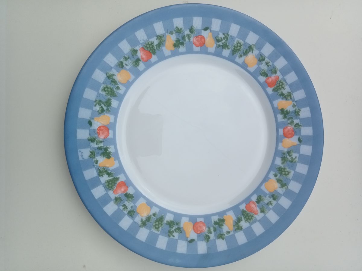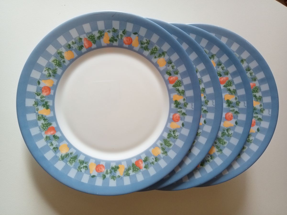 Lot de 4 assiettes à dessert de marque Arcopal en faïence blanche. Quelques rayures sur le fond des assiettes. Contour bleu décoré de fruit. Possibilité d'envoi à l'international.