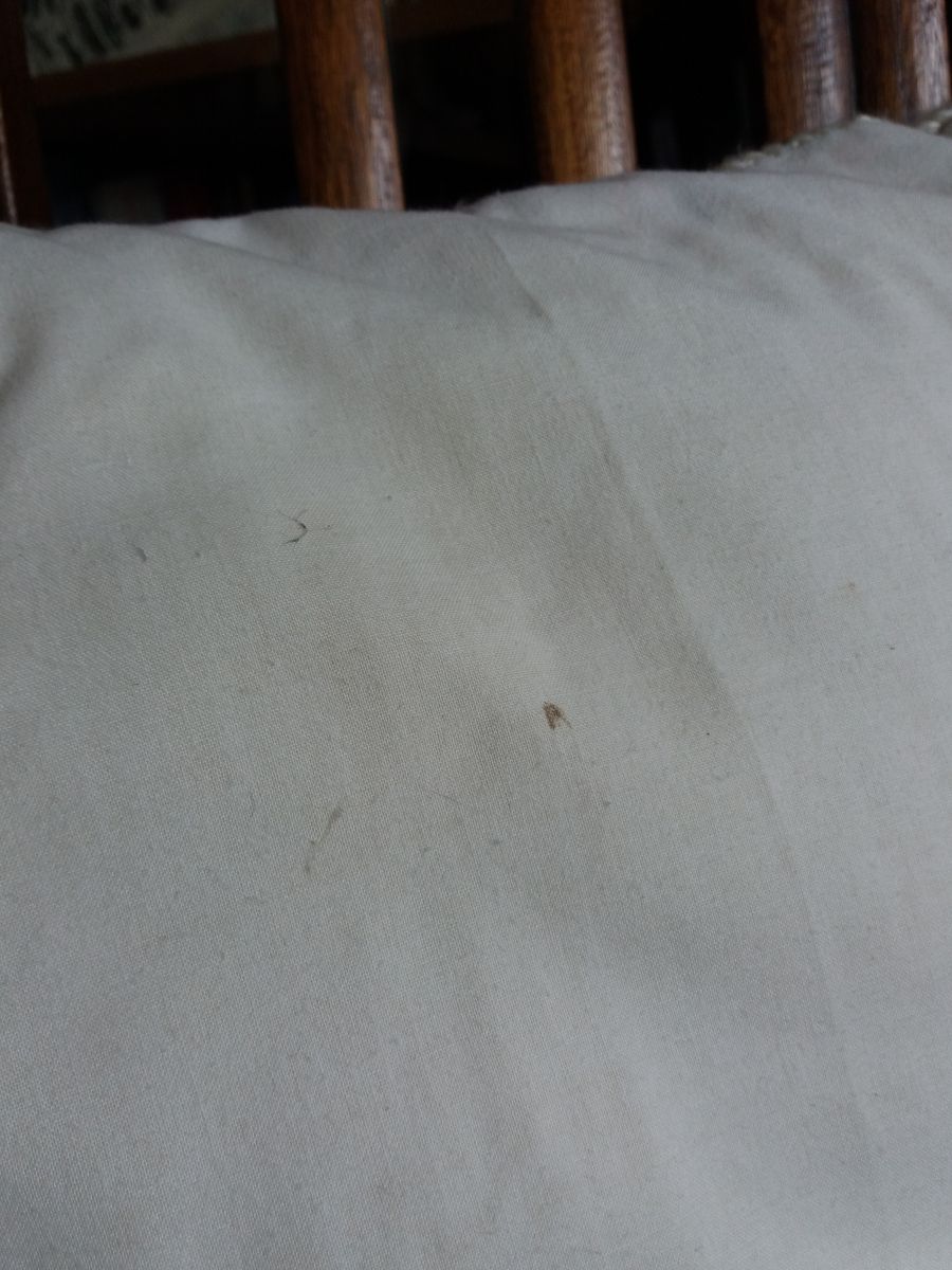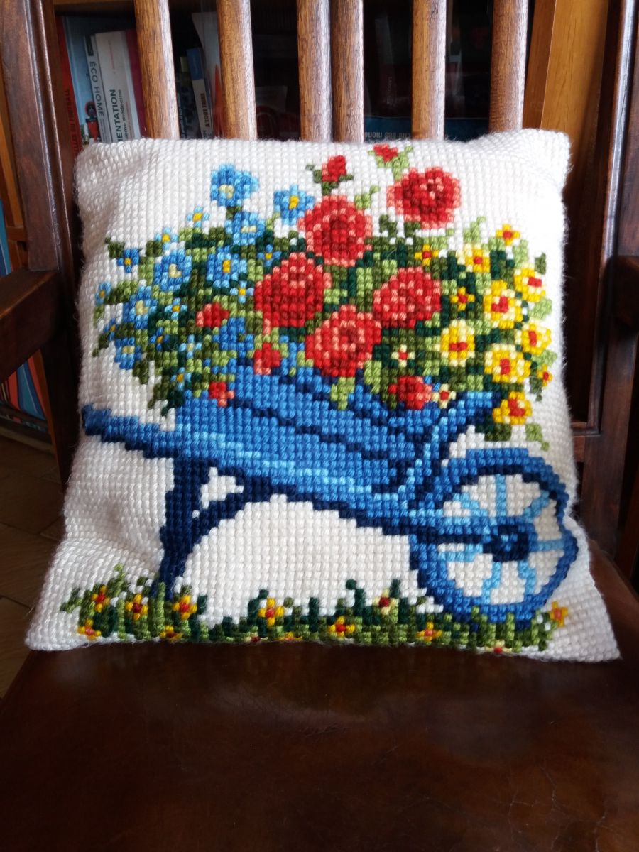 Charmant coussin coloré présentant une brouette fleurie en canevas à fils épais en face avant, de la laine il me semble, et un tissu blanc cassé en face arrière. Il a été fait à la main, probablement dans les années 50 à 70. Il me semble que c’est une housse, c’est à dire qu’à l’intérieur, le rembourrage est encore emballé une seconde fois, mais aucune ouverture n’est prévue pour déhousser la partie extérieure, pour cela il faudrait défaire une couture (faite à la main). Je ne peux donc pas déterminer la matière du garnissage, probablement des petits carrés de mousse ou de kapok (matière végétale) comme cela se faisait beaucoup à l’époque. Je l’ai passé à la machine à laver, mais il subsiste petites taches et des colorations légères à l’arrière. Il est en relativement bon état, pas de tache en face avant, pas de fil cassé mais présente des signes de son âge et d’usage : les fils de laine s’effilochent ou boulochent, je ne sais pas exactement quel terme utiliser. Et trois « cases » ont été oubliées au moment de faire le canevas mais c’est très peu visible. Il mesure environ 38 cm de côté pour une épaisseur maximale d’environ 14 cm. Il pèse un peu plus de 600g.