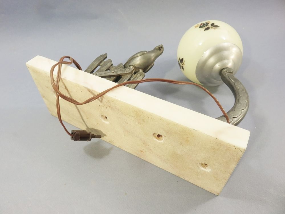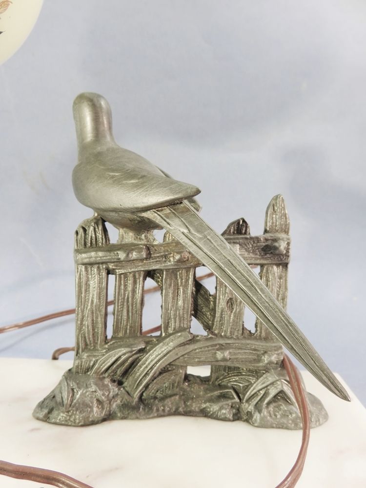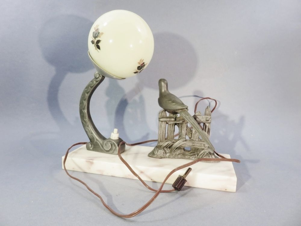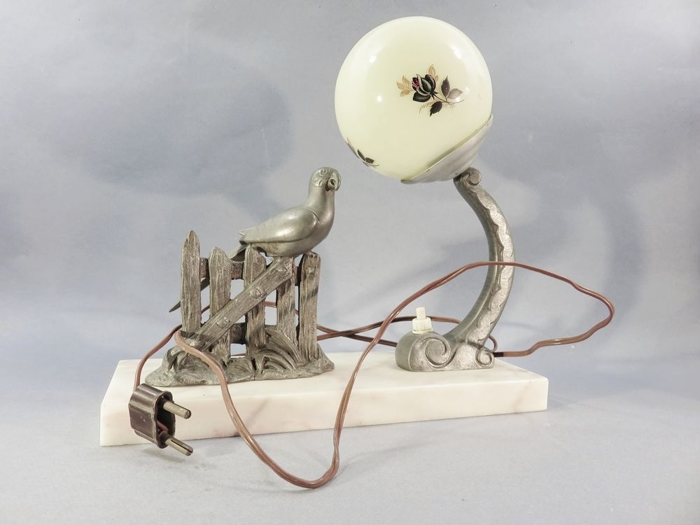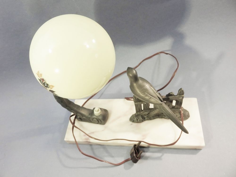 Charmante LAMPE PARROQUET des années 50'S en régule gris, globe en verre opaline jaune paille sur socle en marbre. Alimentation d'origine. Bel objet très décoratif...