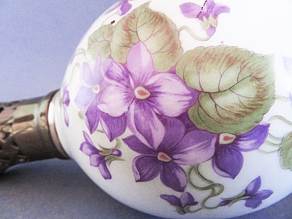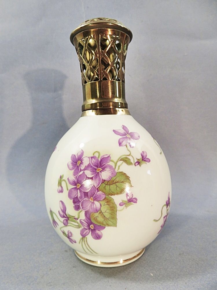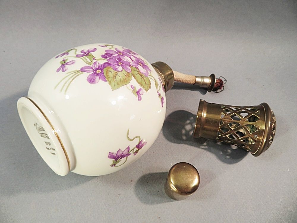 Très élégante LAMPE BERGER THARAUD en porcelaine de Limoges. Décor aux violettes. Garniture d'origine en laiton.