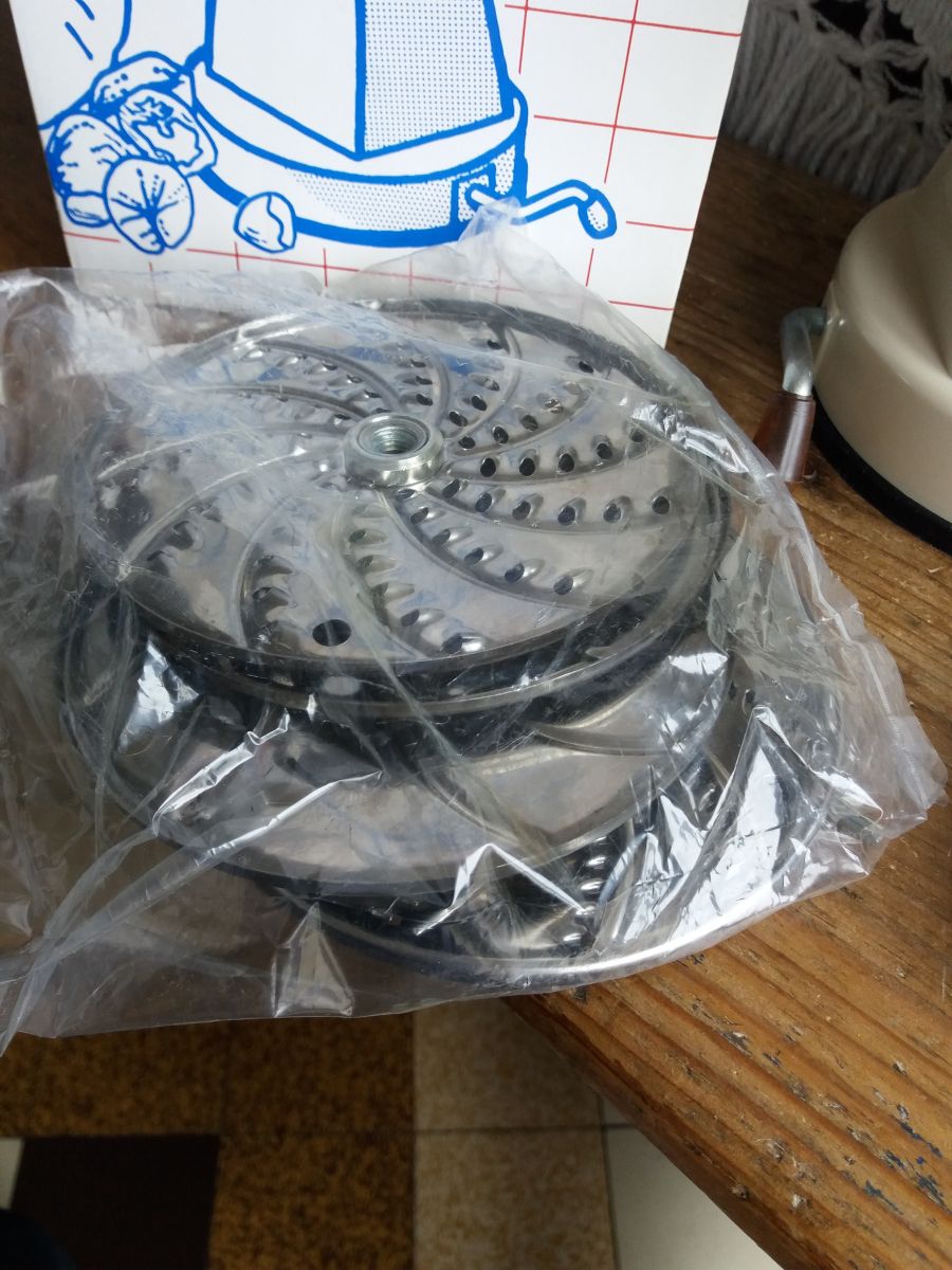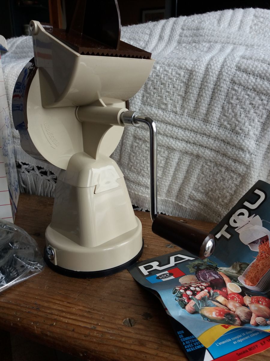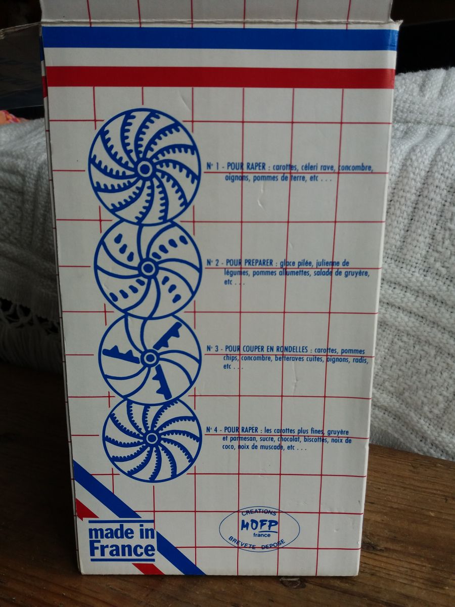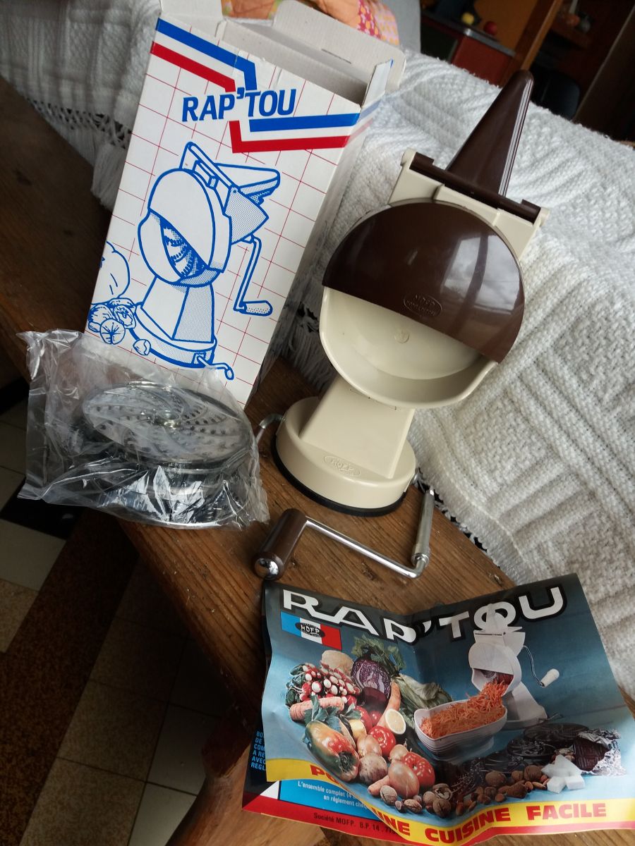 Ensemble complet pour raper, émincer, couper en rondelles légumes et autres aliments sans besoin d’électricité. Nommé Rap’tou, cet ustensile a été fabriqué en France par la société MOFP. Il doit dater des années 70 et n’a jamais été utilisé (les disques en métal sont encore emballés). Le carton me semble complet, avec même le mode d’emploi. Juste deux ou trois petites taches sur le carton d’emballage.