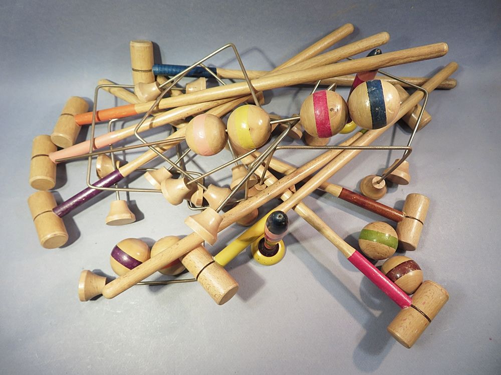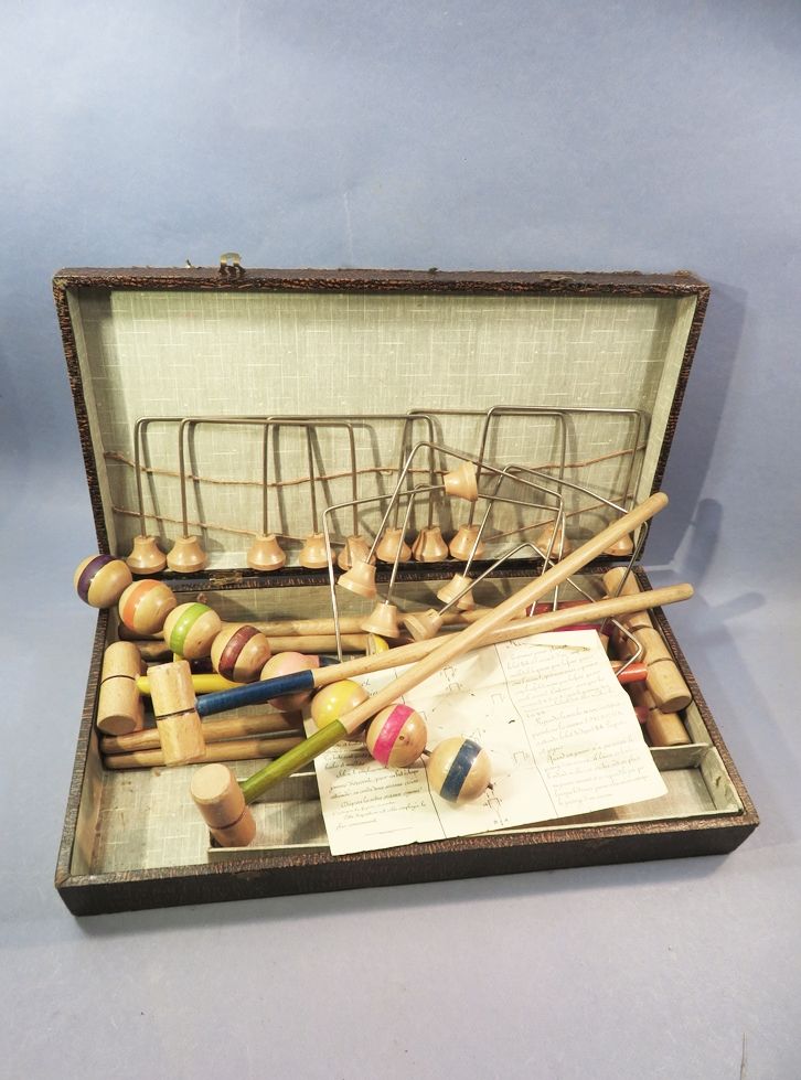Ancien COFFRET CROQUET DE SALON en bois. Complet avec tous ses éléments en bois et métal ainsi que son mode d'emploi (papier froissé)...