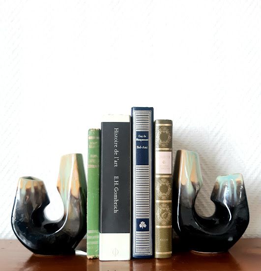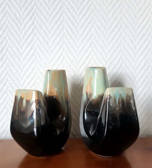 Paire de doubles vases en céramique vintage, pouvant faire serre-livres. Email en dégradé de couleur bleu turquoise à marron foncé. Numérotés au revers.