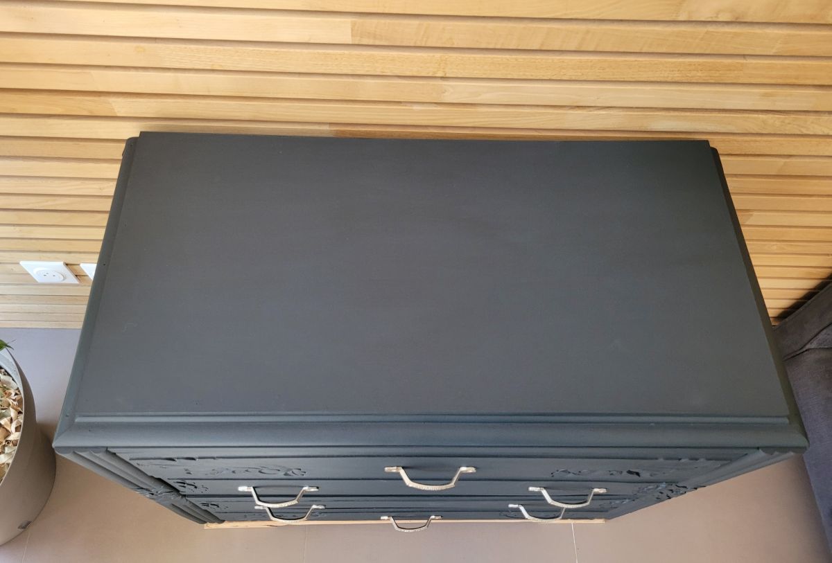 Commode art déco en bois massif avec empiètement moustache. Elle a été entièrement restaurée: nettoyée, poncée et repeinte dans la nuance Black blue de chez Farrow and Ball, finition matte. La commode est en bon, étant donné l'âge du meuble, le bois a un peu travaillé par endroits (voir photos). Les poignées en aluminium sont d'origine. Le meuble est sain, stable et propre. Les tiroirs coulissent parfaitement.