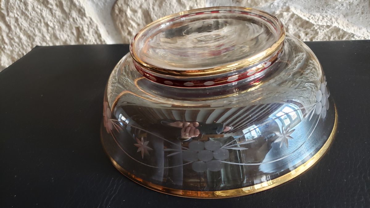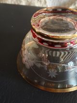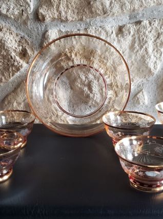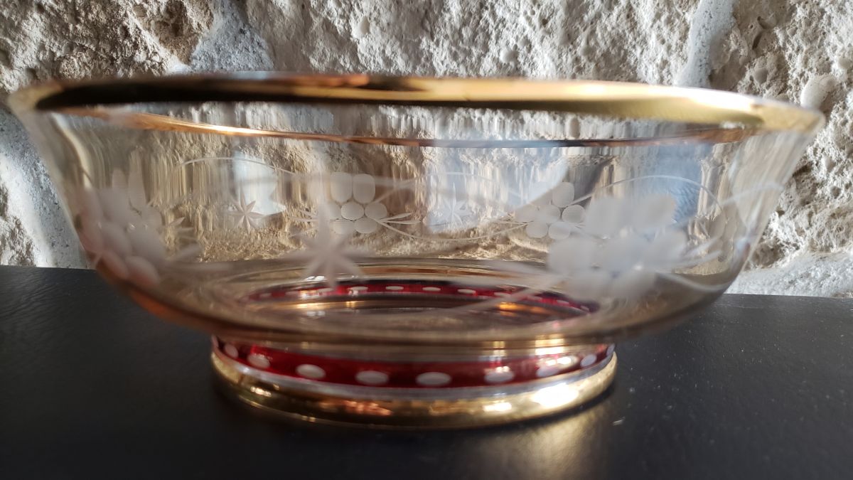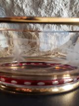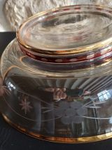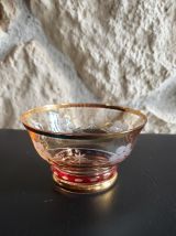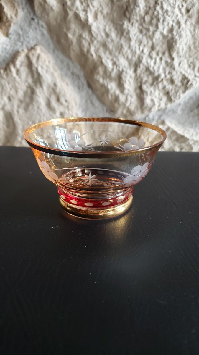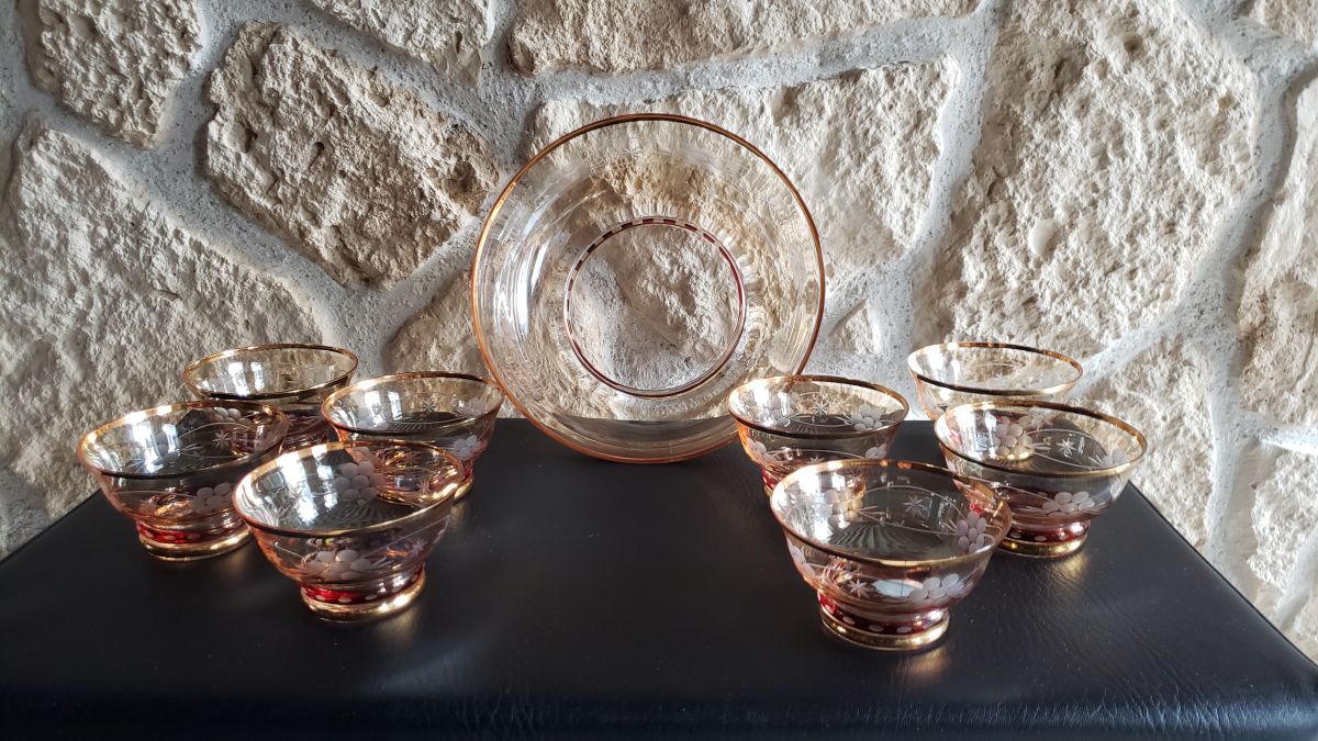 Saladier + 8 belles coupelles en verre transparent avec plusieurs liserés or et rouge ainsi que de jolis motifs granités blancs.