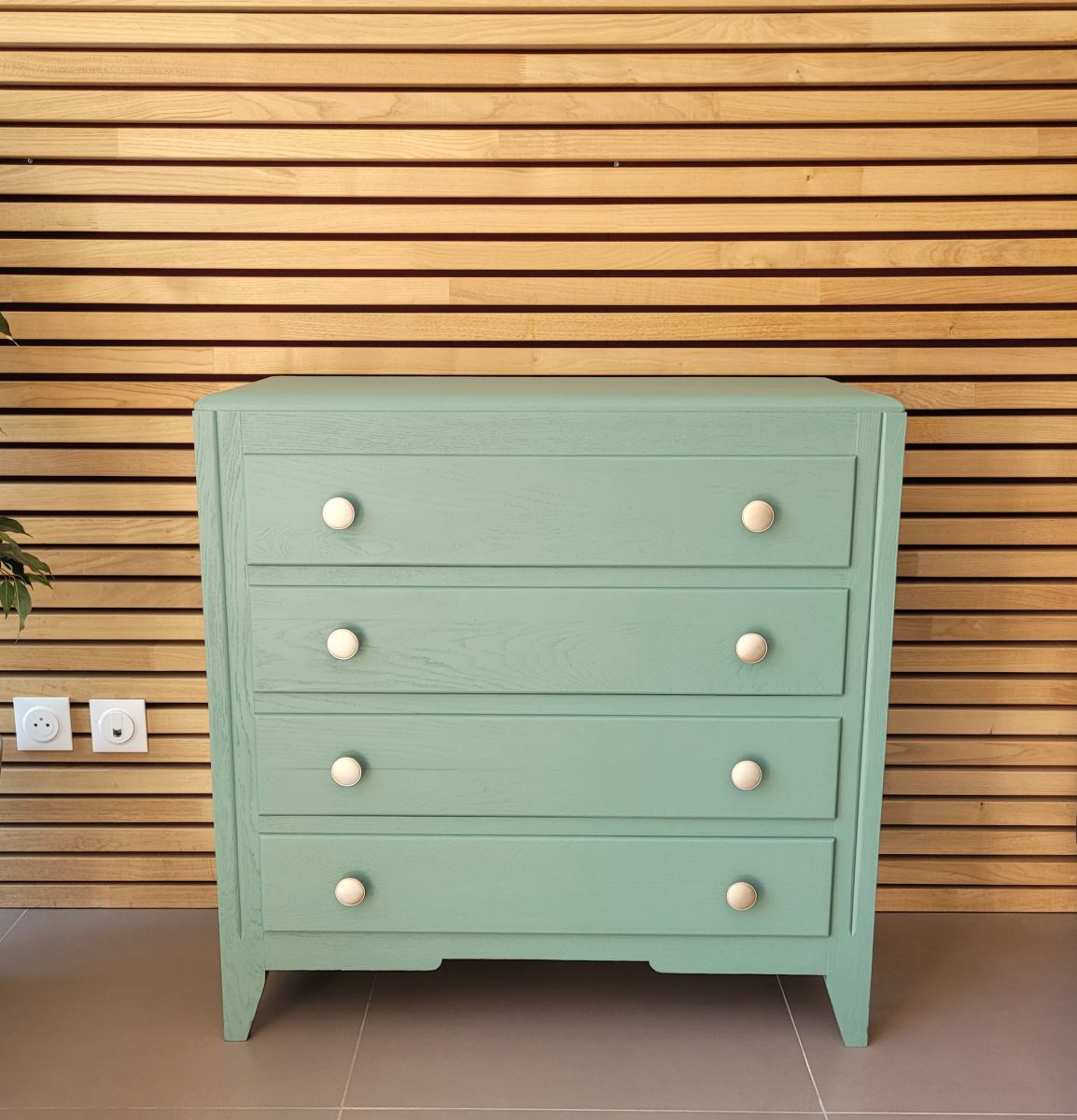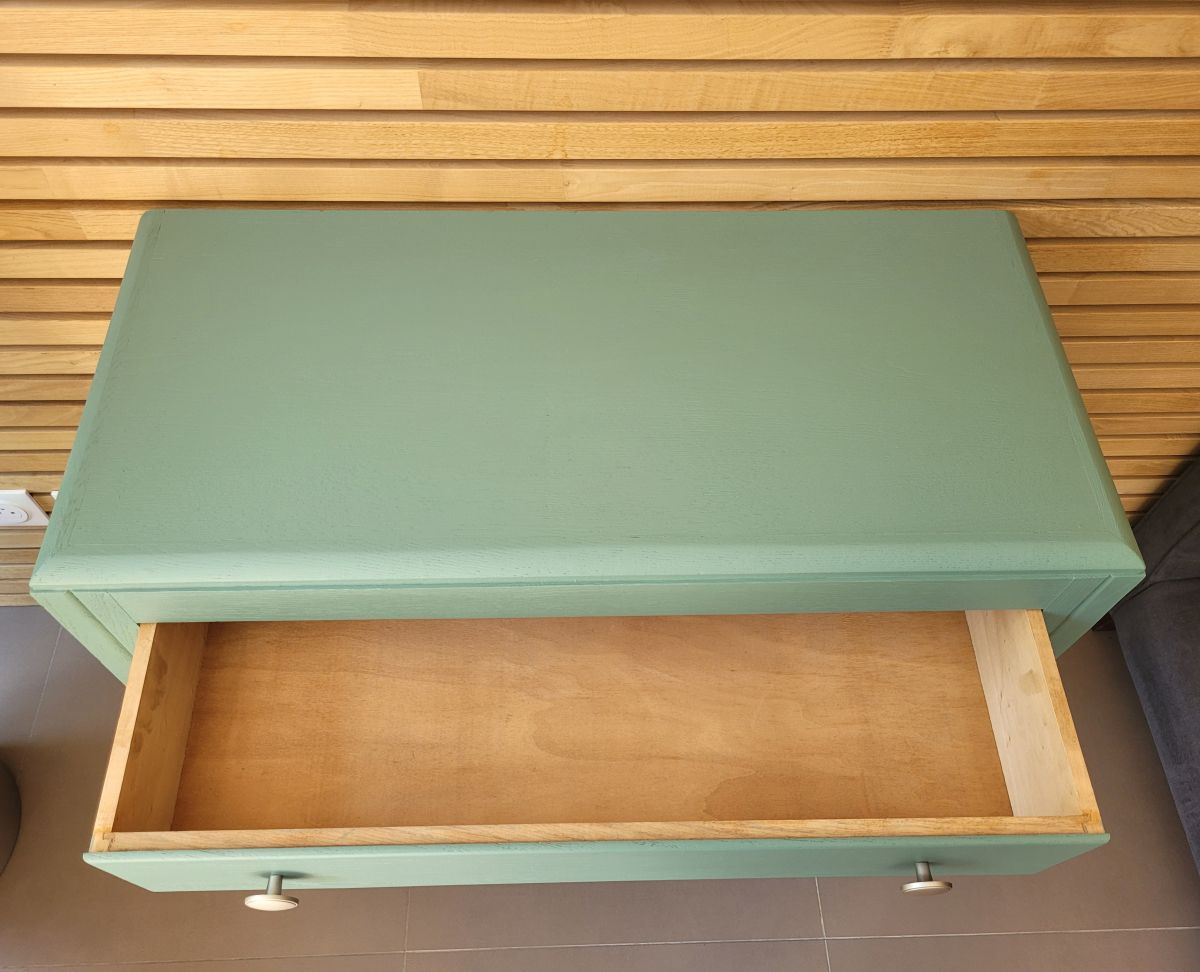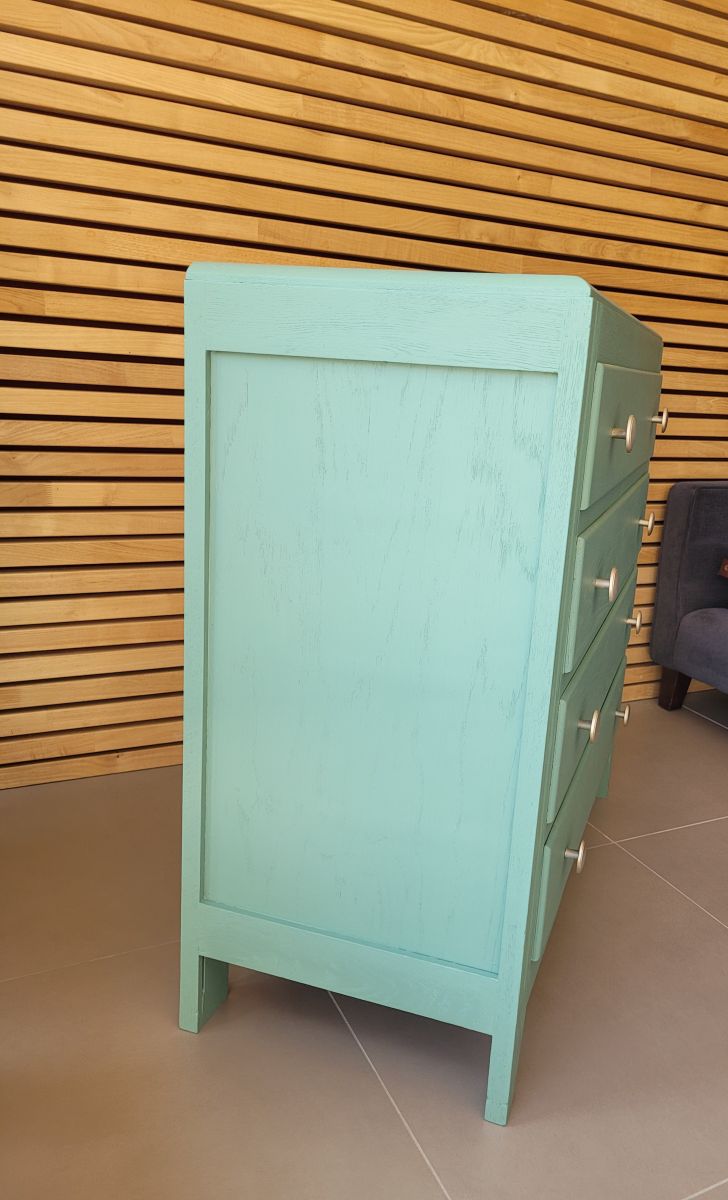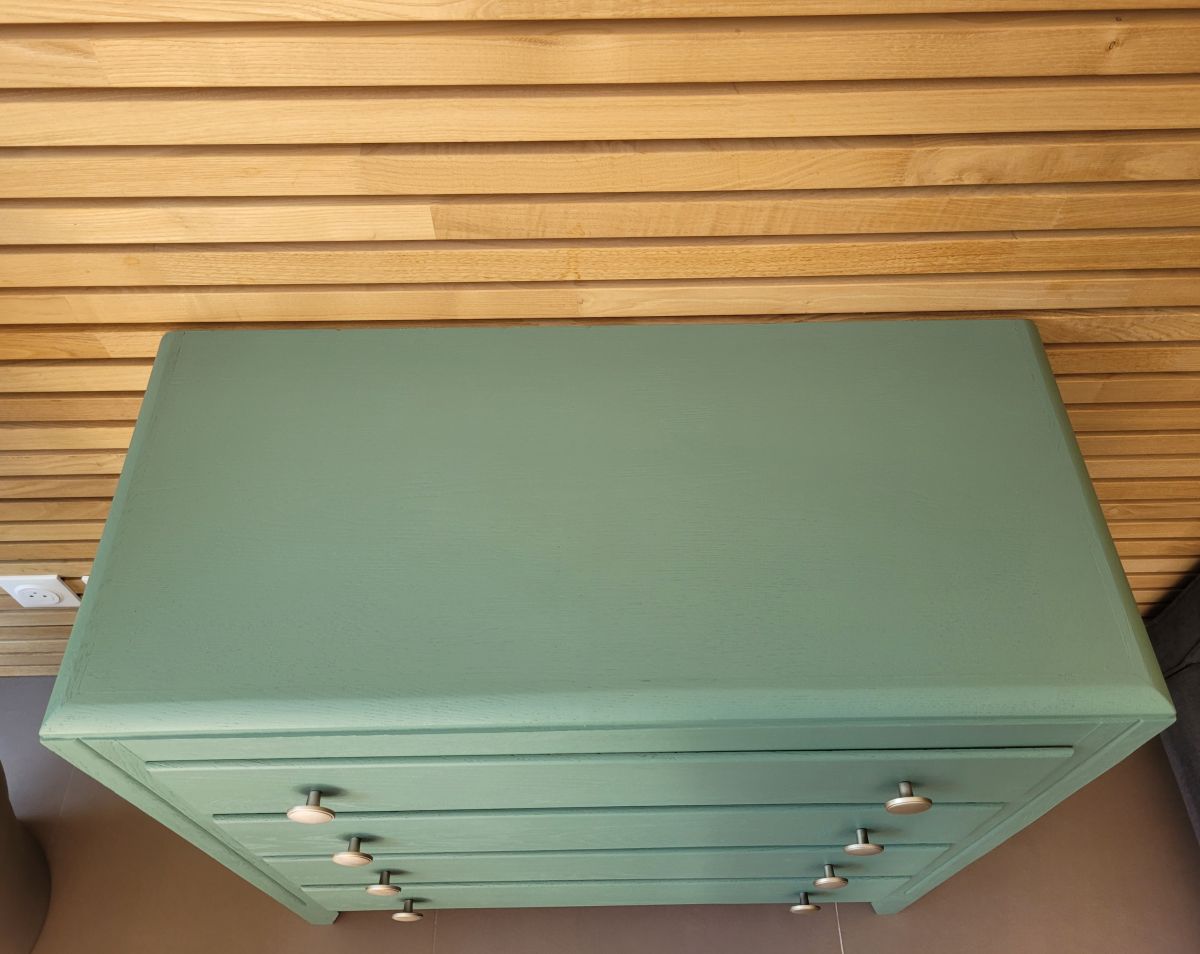 Grande commode vintage années 60 en bois massif. Elle a été entièrement restaurée: nettoyée, poncée repeinte dans la nuance "glaz" de chez Ressource (mate légèrement satinée). La commode est en très bon état. Les boutons en aluminium sont d'origine. Le meuble est sain, stable et propre. Les tiroirs coulissent parfaitement.