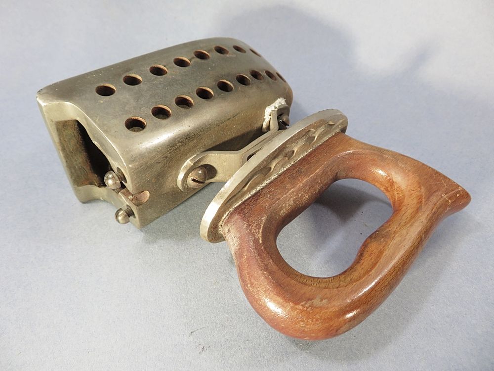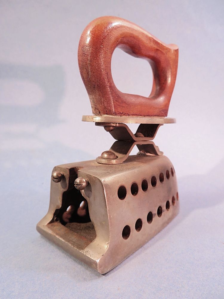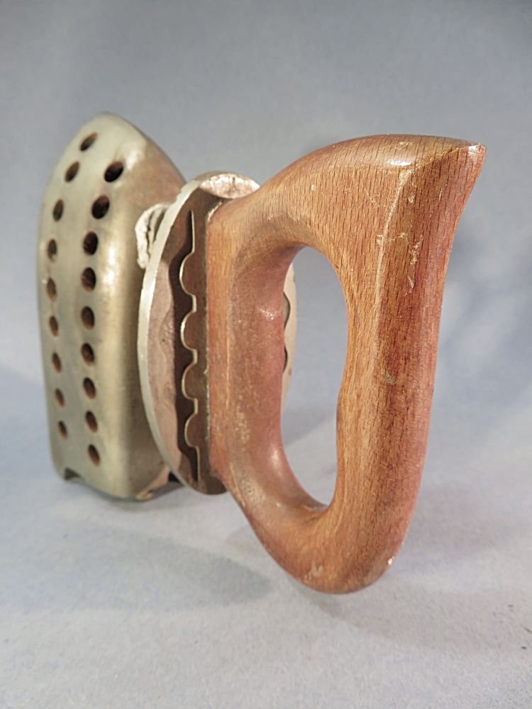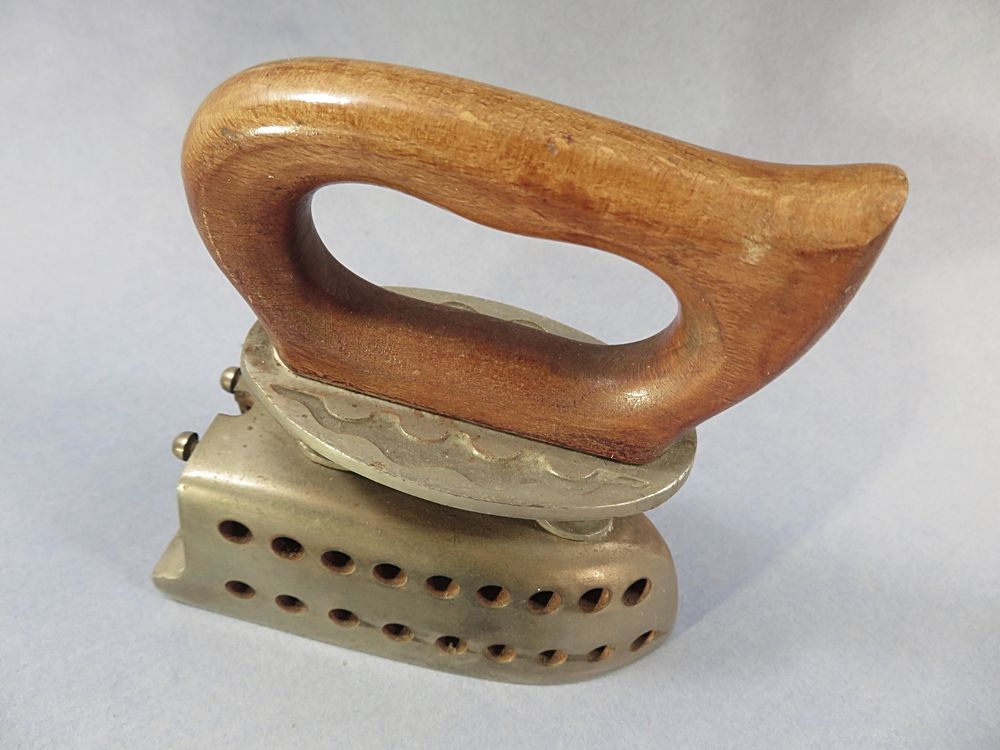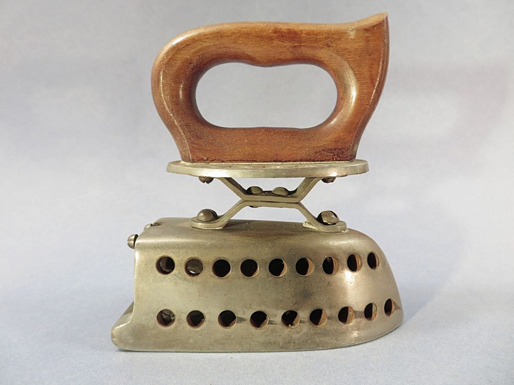 Original FER A REPASSER ancien en métal nickelé (couleur chrome) ... Poignée isolante en bois.