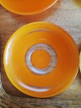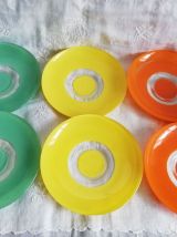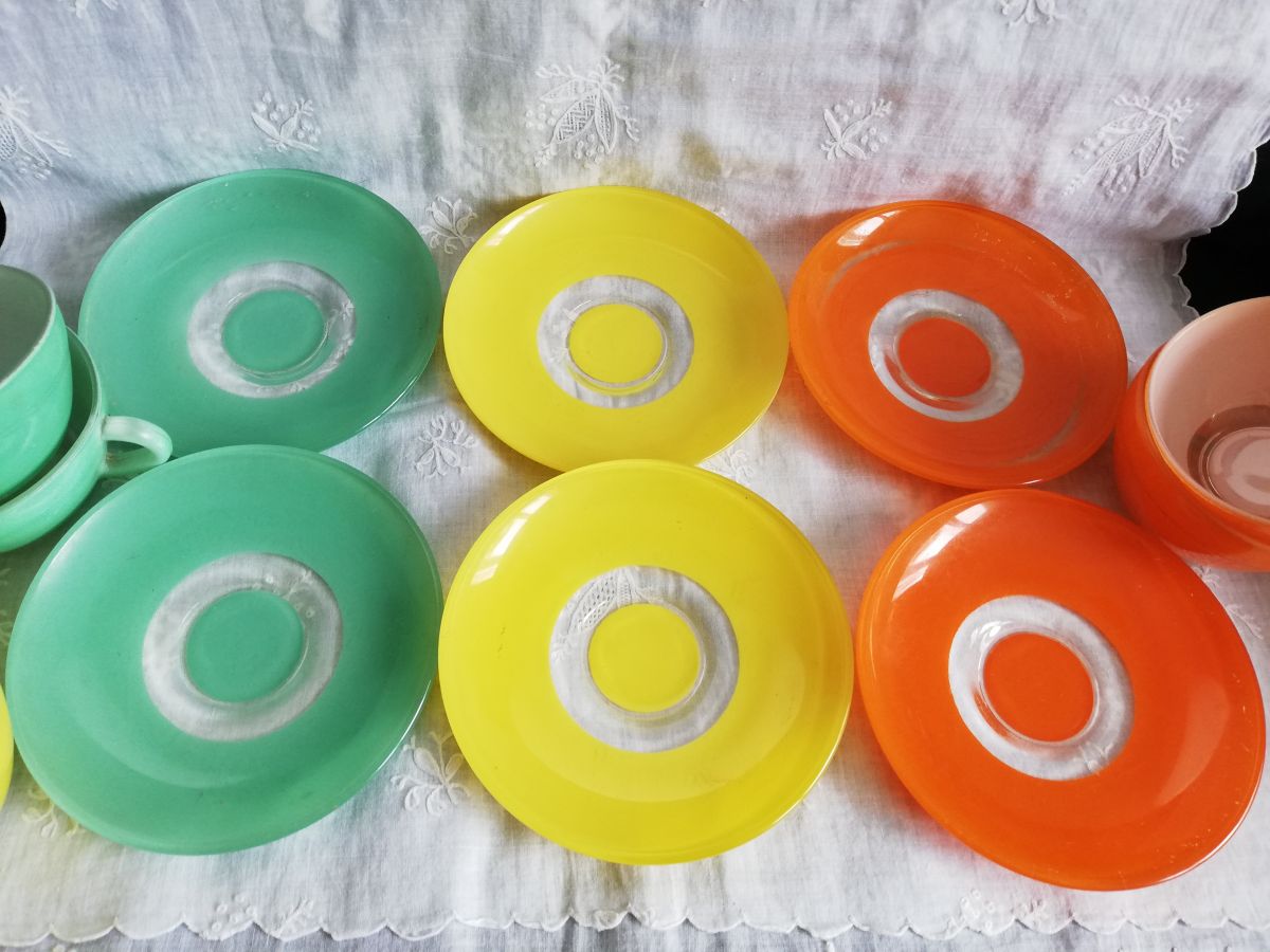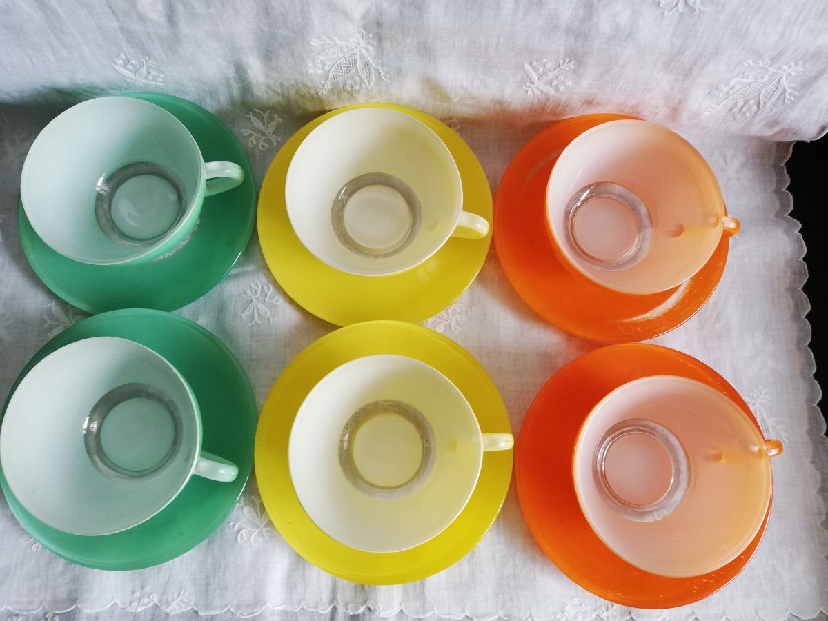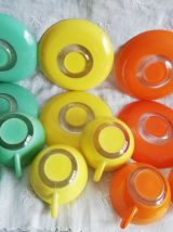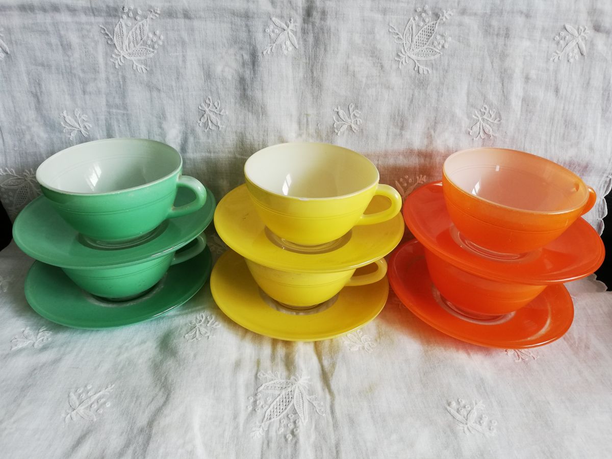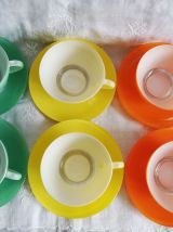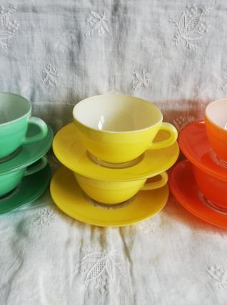 Un peu de gaieté et de bonne humeur sur votre table avec ce service à café aux couleurs vitaminées. Service des années 60, couleurs orange, verte, jaune classiques de la marque Duralex à cette époque.