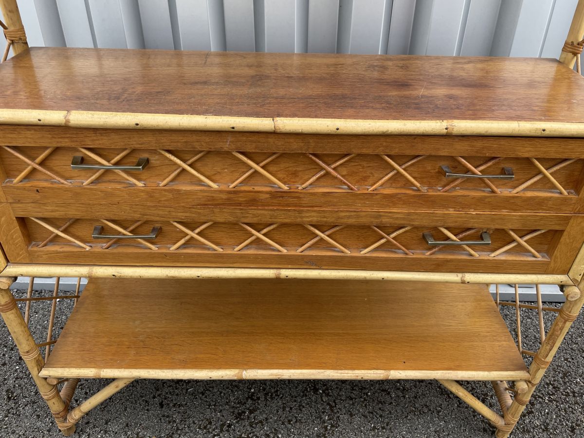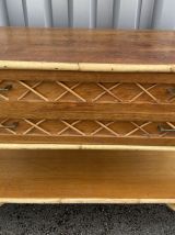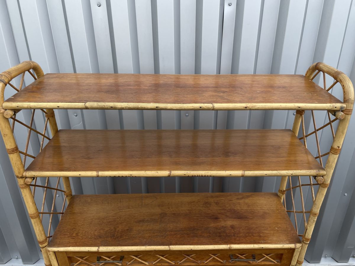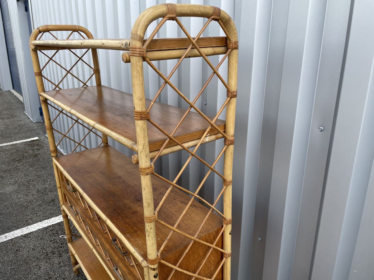 Etagère en rotin des années 60, design Louis Sognot, 4 plateaux (96x30cm),2 tiroirs avec poignées en laiton d’origine, superbe patine, dimensions (cm) : L.100xH.140xP.30, bon état.