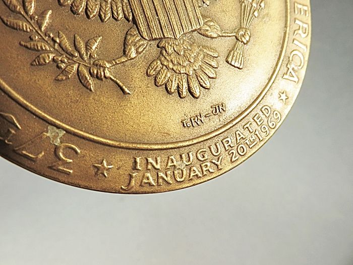 Authentique MEDAILLE EN BRONZE RICHARD MILHOUS NIXON 37 th PRESIDENT OF THE UNITED STATES OF AMERICA INAUGURATED JANUARY 20 th 1969. Signature RALPH.J.MENCONI et datée 1969