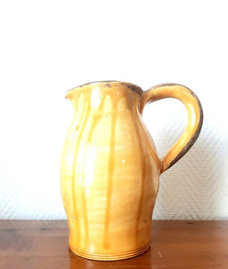 Broc émaillé jaune avec effets de coulures brunes. Epaisse prise latérale arrondie. signé au revers en creux J.P.M.