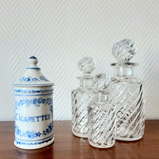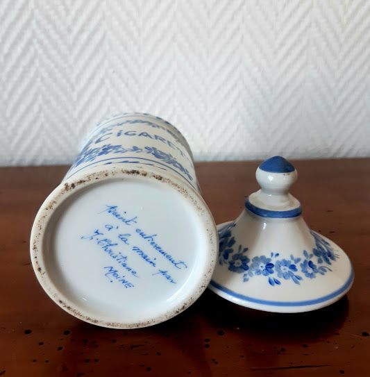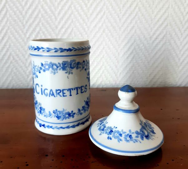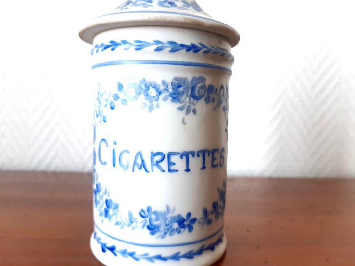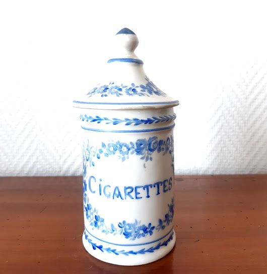 Pot d'apothicaire couvert en porcelaine peinte. Décor floral bleu sur porcelaine blanche avec inscription sur le devant "cigarettes".