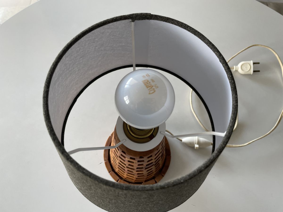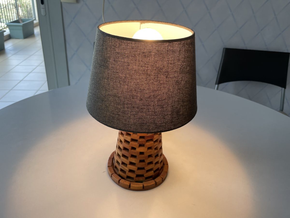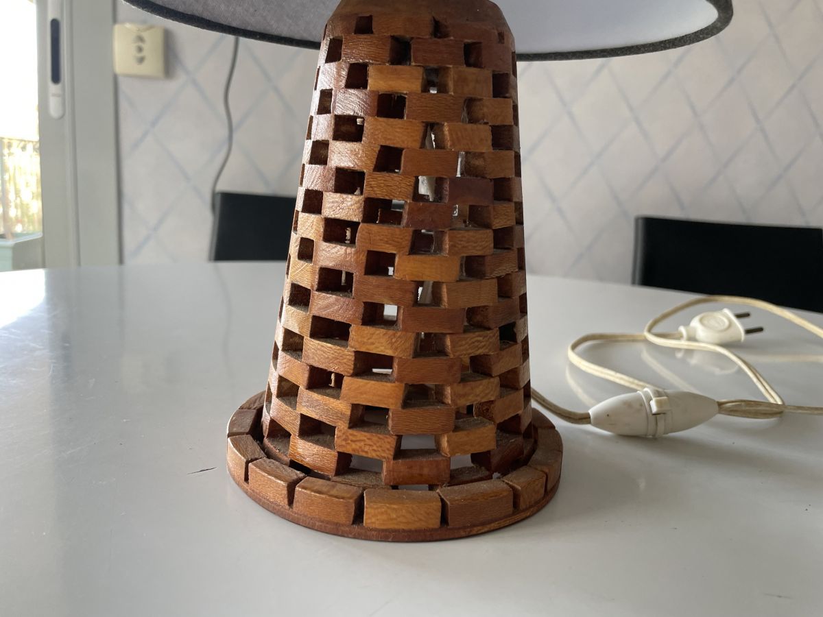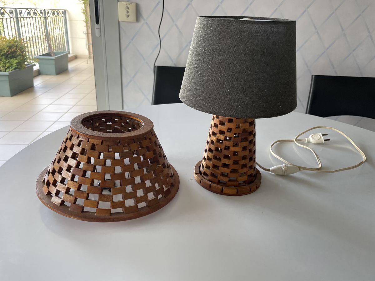 Lampe en bois ajouré des années 70, vernie, abat-jour neuf, fonctionne parfaitement, ampoule baïonnette, livrée avec l’abat-jour d’origine à restaurer (diamètre 20cm, hauteur 12cm), hauteur 30cm, diamètre abat-jour 20cm, diamètre socle 13cm, bon état.