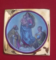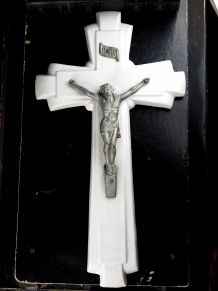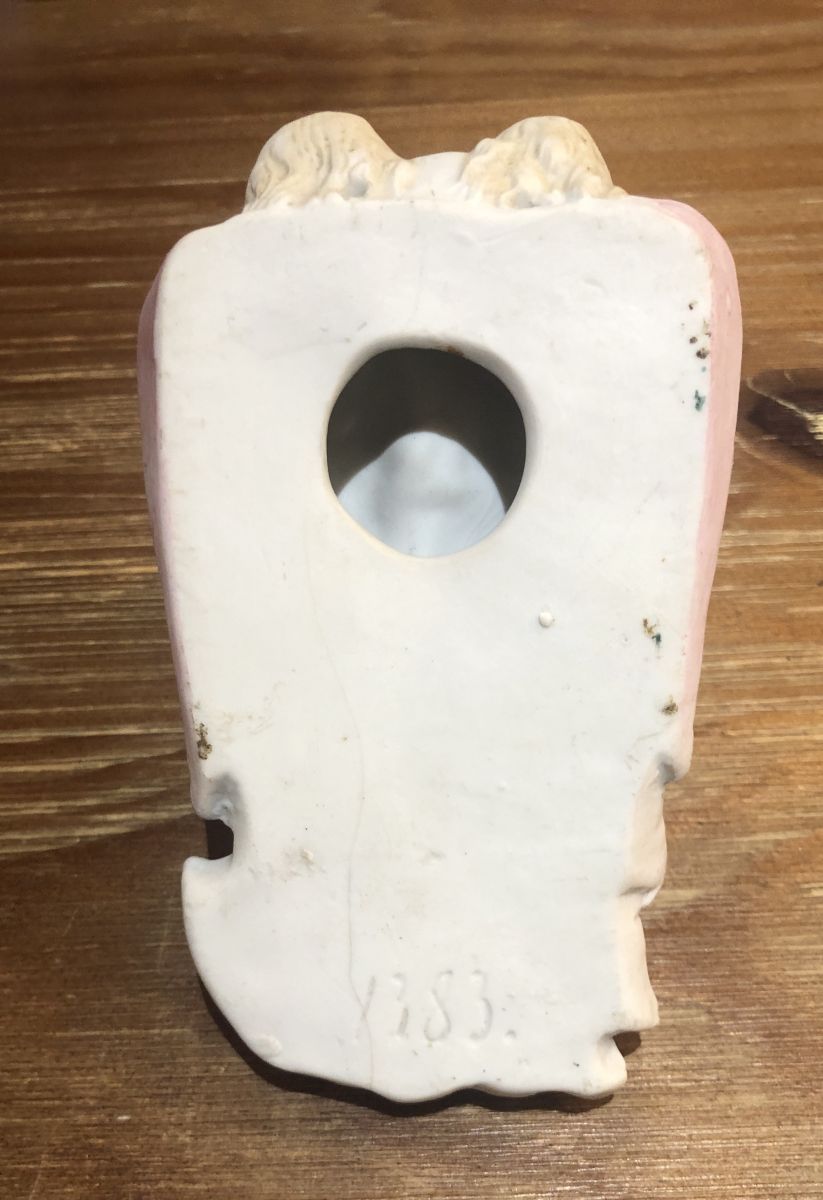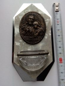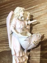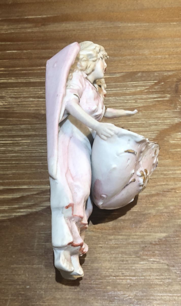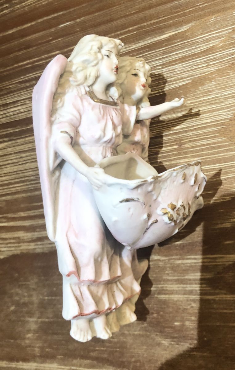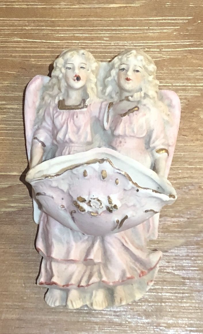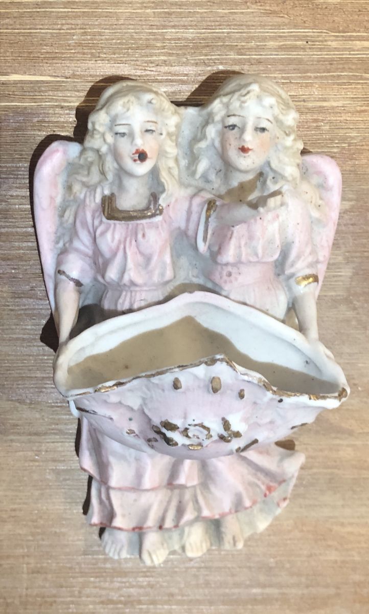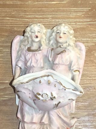 Bénitier deux anges rose en biscuit, manque la trompette.