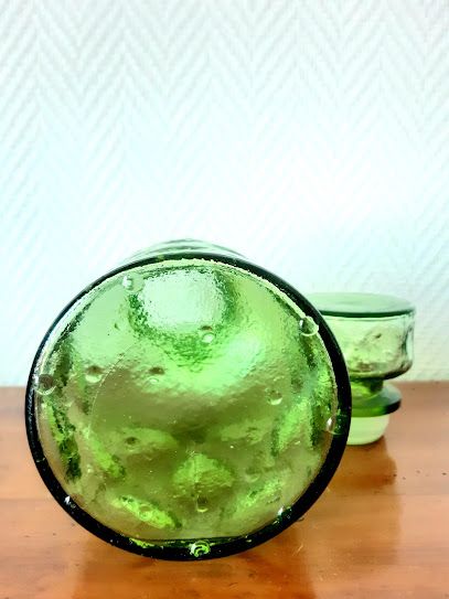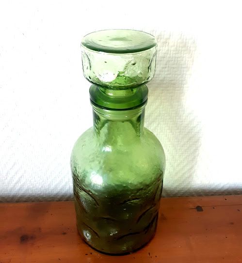 Carafe en verre moulé italien avec effet de creux pour une meilleure prise. Bouchon d'origine. Sa couleur verte donne une allure estivale et lumineuse à l'objet. Le bouchon est hermétique grâce à sa bague en plastique.