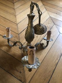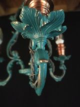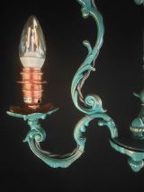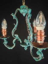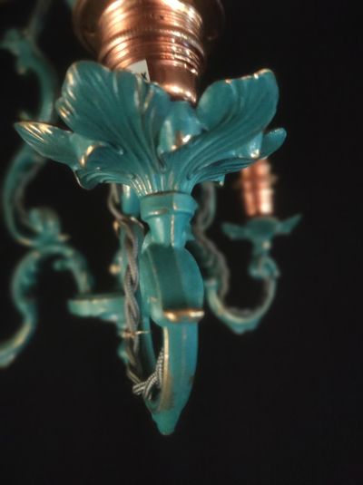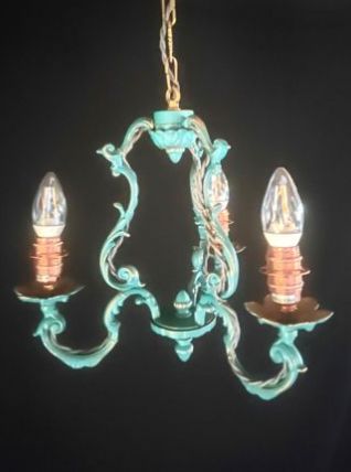 Suspension en laiton de 3 points lumineux, laiton doré et peinture vieillie. Véritable lustre de style vintage, la couleur bleue lui donne un aspect baroque de boudoir. Démontage, vérification, peinture et électrification réalisées dans nos ateliers. Luminaire ref 0322.07 lot 03/2022. Caractéristiques: • câble: câble torsadé textile gris effet soie. • poids: 2, 1 kg • 3 douilles: métal finition cuivrée e 14. • classe isolation: classe i, luminaire avec une isolation principale reliée à la terre. • pavillon laiton, ø 8 cm, fixation par bélière, raccord terre. • raccordement électrique par dominos à levier. • puissance: 15 w max par douille.