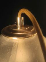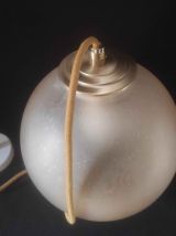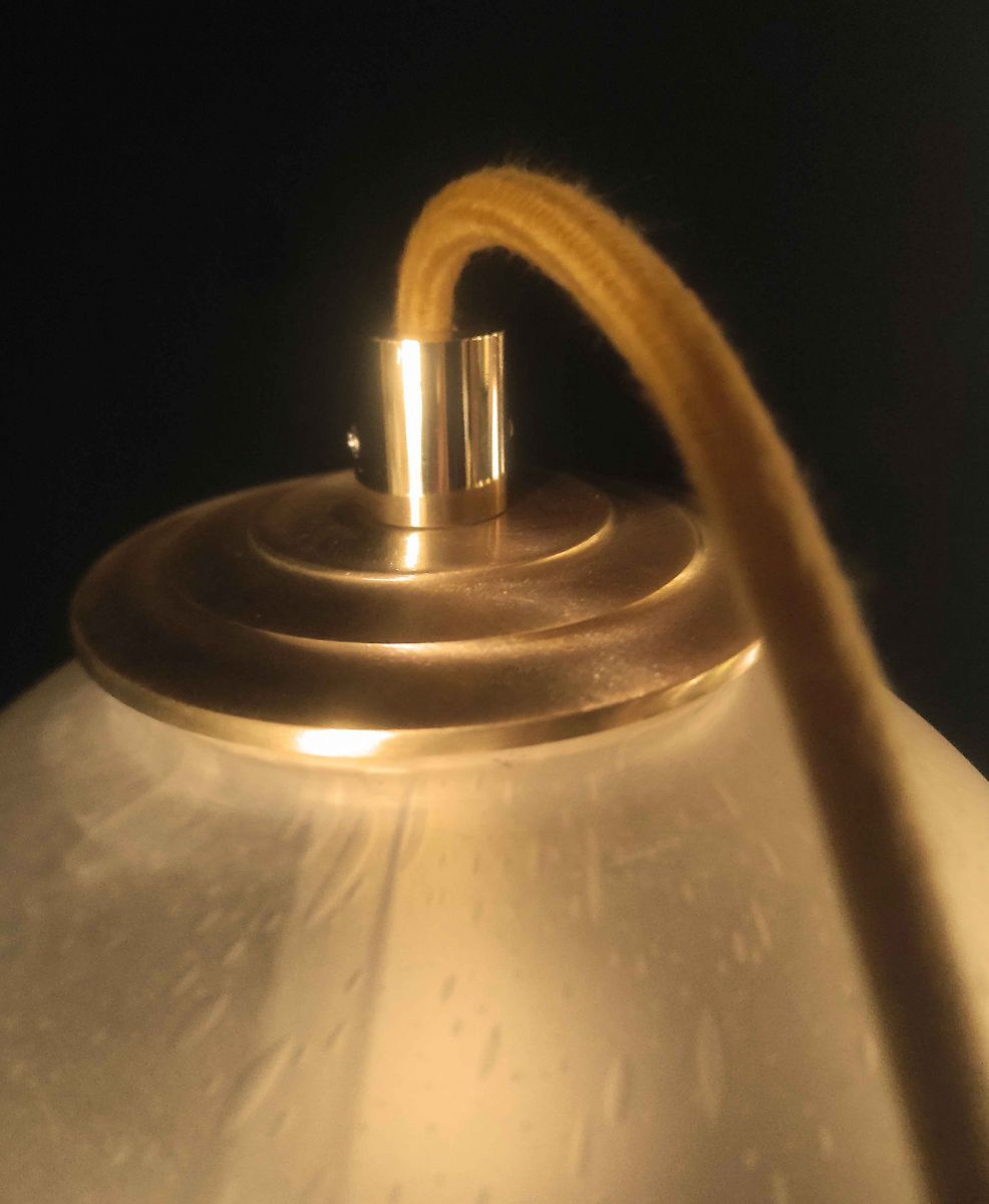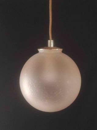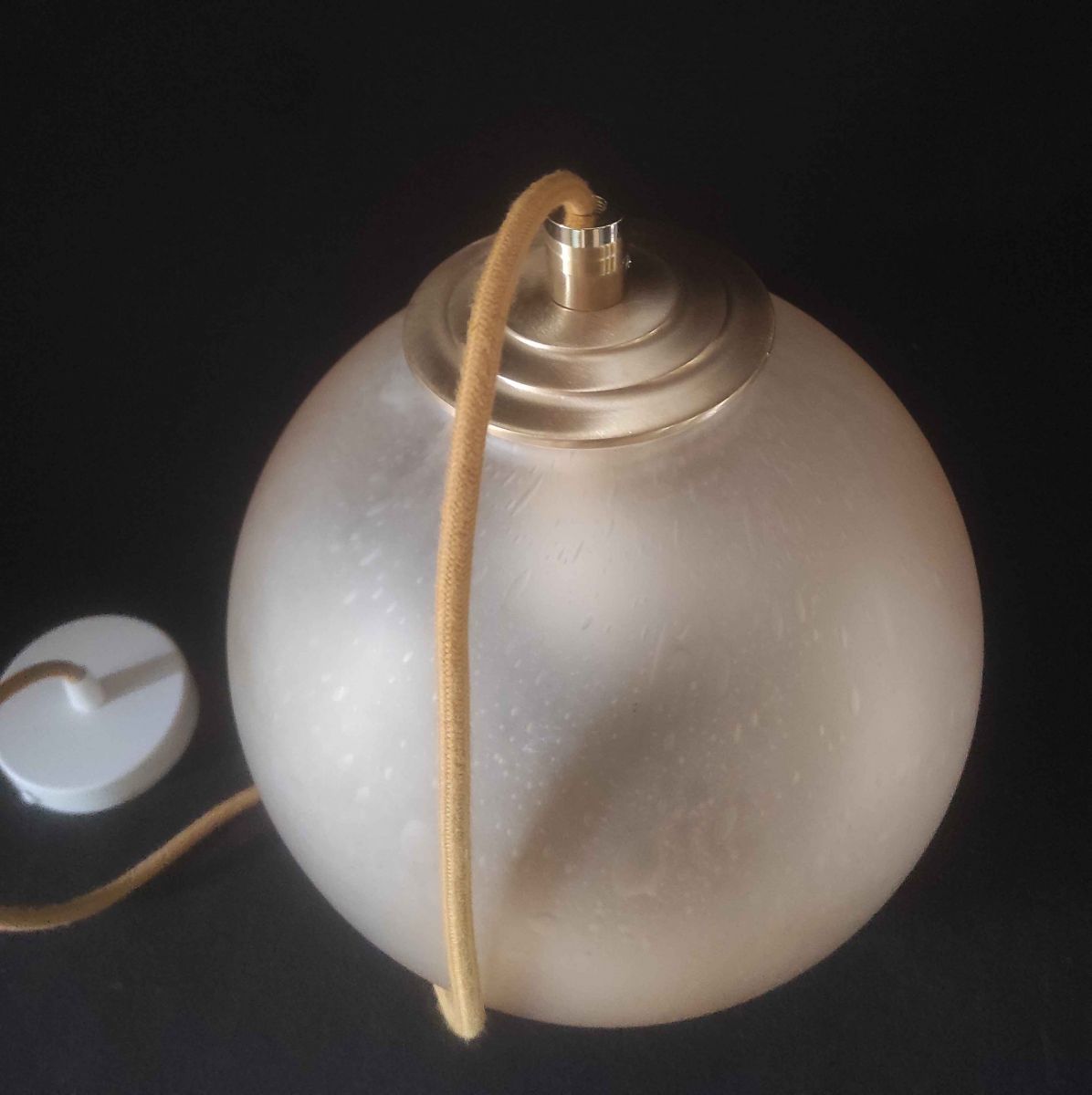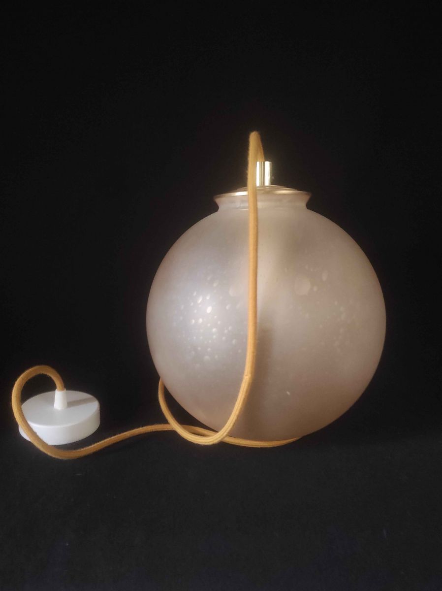 Grand globe en verre soufflé, opaque de couleur doré. Ce globe est imposant par sa taille, sa couleur et l’effet des nombreuses bulles. L’esprit design des années 70’ est total. L’électrification est neuve avec une mise à la terre de la douille métal. La rosace est en métal. Le globe est suspendu par un long câble d’un mètre en coton de couleur mile doré. Luminaire ref 0922.03 lot 09/2022. Caractéristiques: • dimensions du globe: 25 cm de diamètre. • douille métal e27 couleur laiton| • rosace métal blanc| • longueur du câble max 1 m, réglable| • accrochage par étrier au plafond| • poids: 1, 2 kg| • câble rond: coton miel doré| • classe isolation: classe i, luminaire avec une isolation principale reliée à la terre| • puissance: 15 w max|