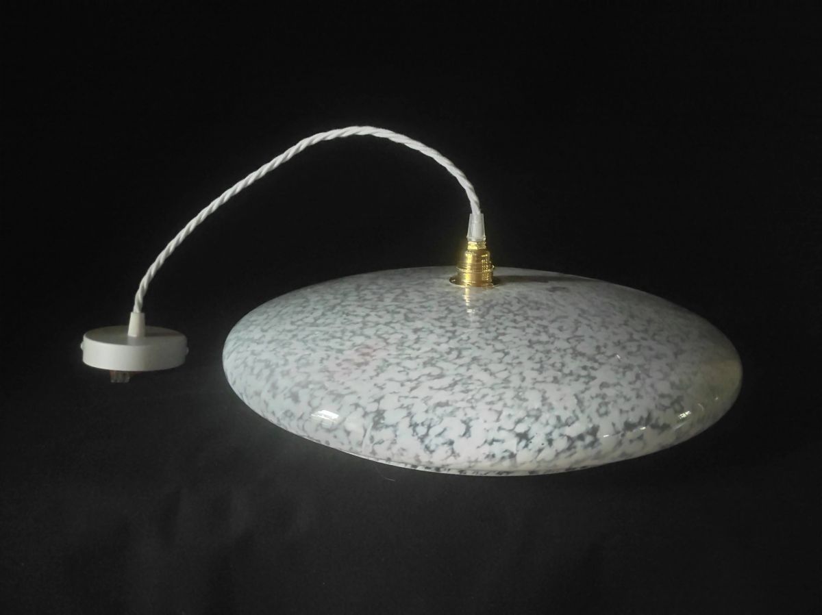 Ce globe est assez imposant par sa taille puisque son diamètre est de 41 cm pour une hauteur de 6 cm. Sa forme plate lui confère un design dans l’air du temps et s’inscrit parfaitement dans un style art déco. Le verre ne montre aucune fêlure, il est en parfait état. Electrification neuve, réalisée dans nos ateliers. Luminaire ref 1022.01 lot 10/2022. Caractéristiques: • câble: rond torsadé blanc coton, longueur 40 cm, trois brins. • poids: 1kg 350 g. • douille: métal finition laiton e 14. • classe isolation: classe i, luminaire avec une isolation principale reliée à la terre. • rosace métal, blanc, ø 8cm, fixation par étrier, raccord terre. • raccordement électrique par dominos à levier. • puissance: 15 w max.