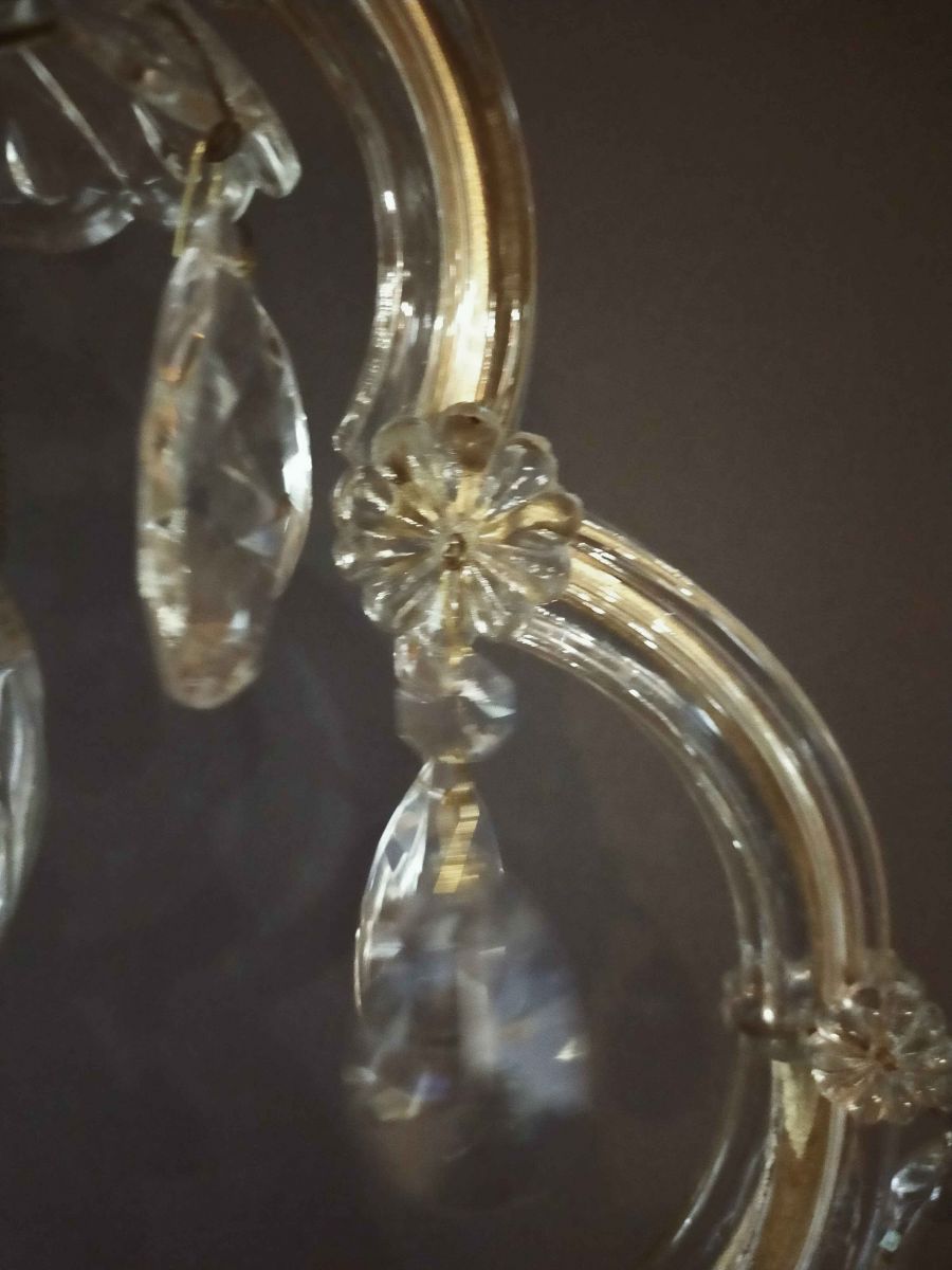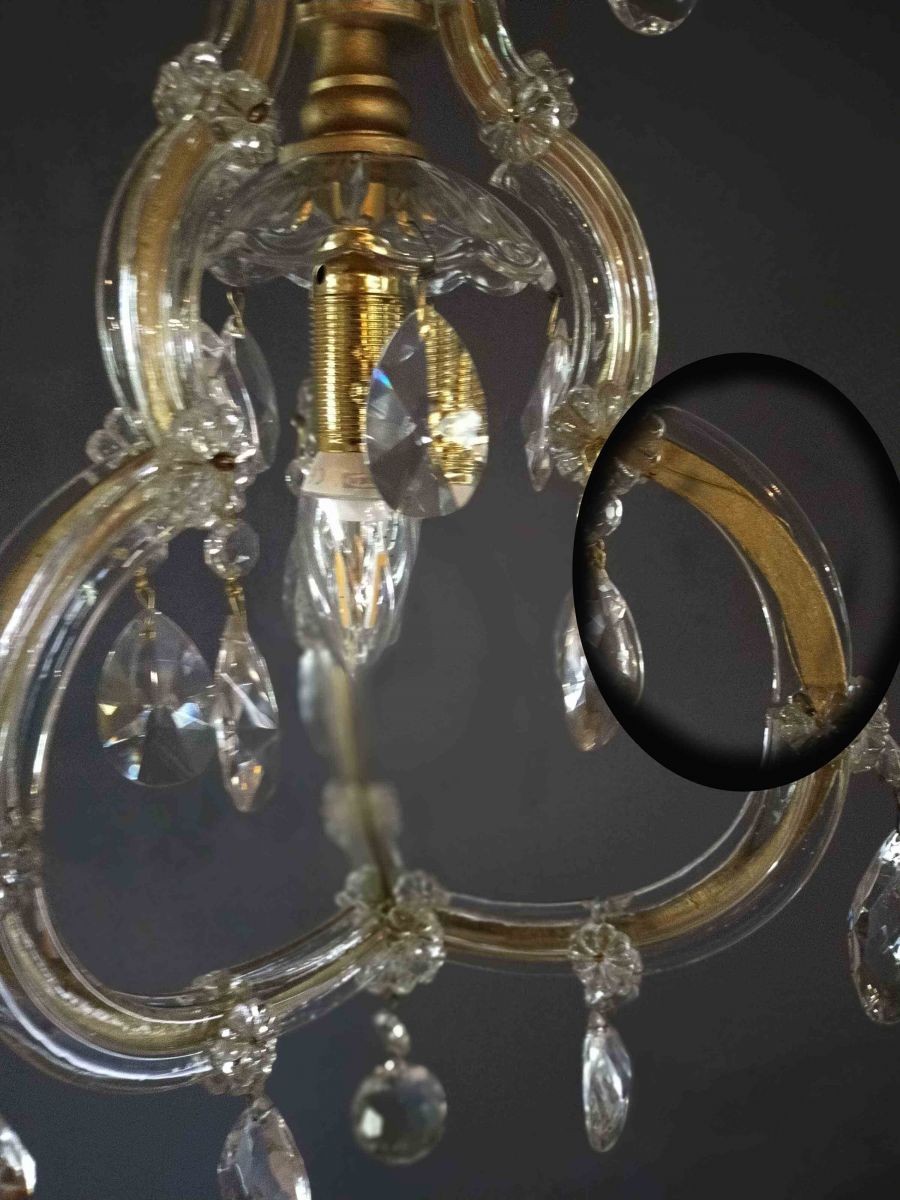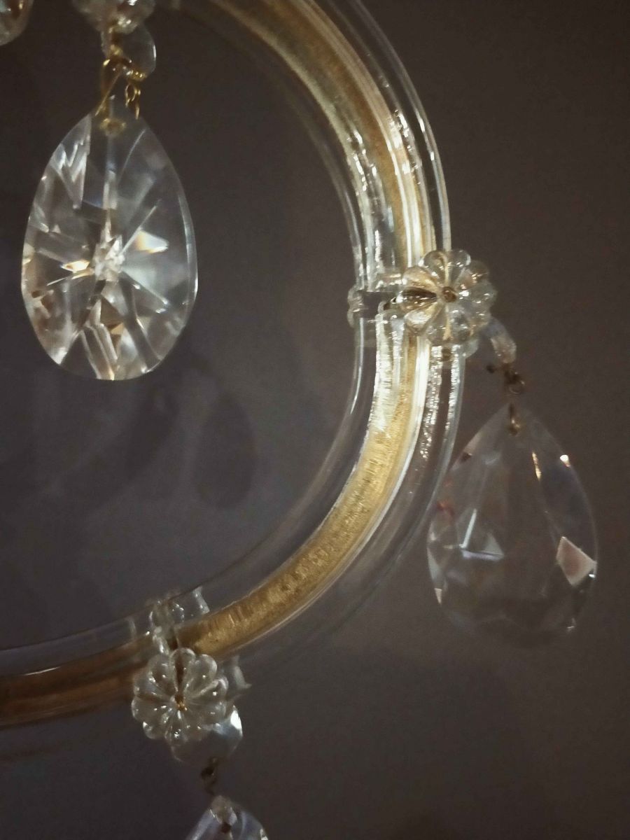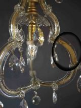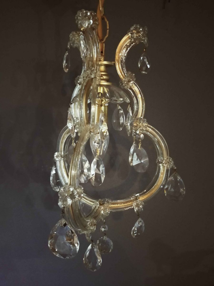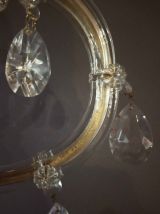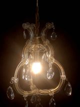 Une suspension à pampilles dans la grande tradition des luminaires produits en italie dans les années 70. Il s’agit d’une production des ateliers b&j design de Milan. Bien qu’en Lombardie, l’industrie du nord de l’Italie est fortement influencée par les productions de verre et de cristal de la région voisine de toscane et des célèbres ateliers de Murano. C’est pourquoi cette suspension est particulièrement équilibrée et joue du plus bel effet malgré sa petite taille. Cette suspension possède trois branches et une ampoule. Ce luminaire a fait l’objet d’une restauration complète. La structure en métal doré a entièrement été redorée à la poudre de bronze et vernie comme à son origine. Certaines pampilles ont été rapportées. Il manque une branche de verre sur un des arcs, c’est pourquoi le prix est relativement modique au vu de la spécificité de ce luminaire. Ce défaut est peu visible en situation. Caractéristiques: • ref 1022.06 lot 10-2022. • dimensions: 23 cm de diamètre, 56 cm de hauteur totale. • douille métal chromé e14| • poids: 1, 700 kg| • câble rond: coton moutarde| • classe isolation: classe i, luminaire avec une isolation principale reliée à la terre| • puissance: 15 w max|