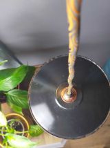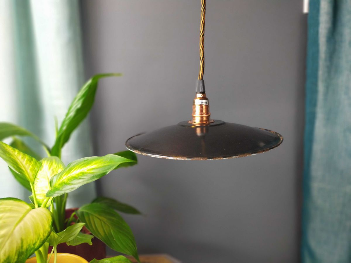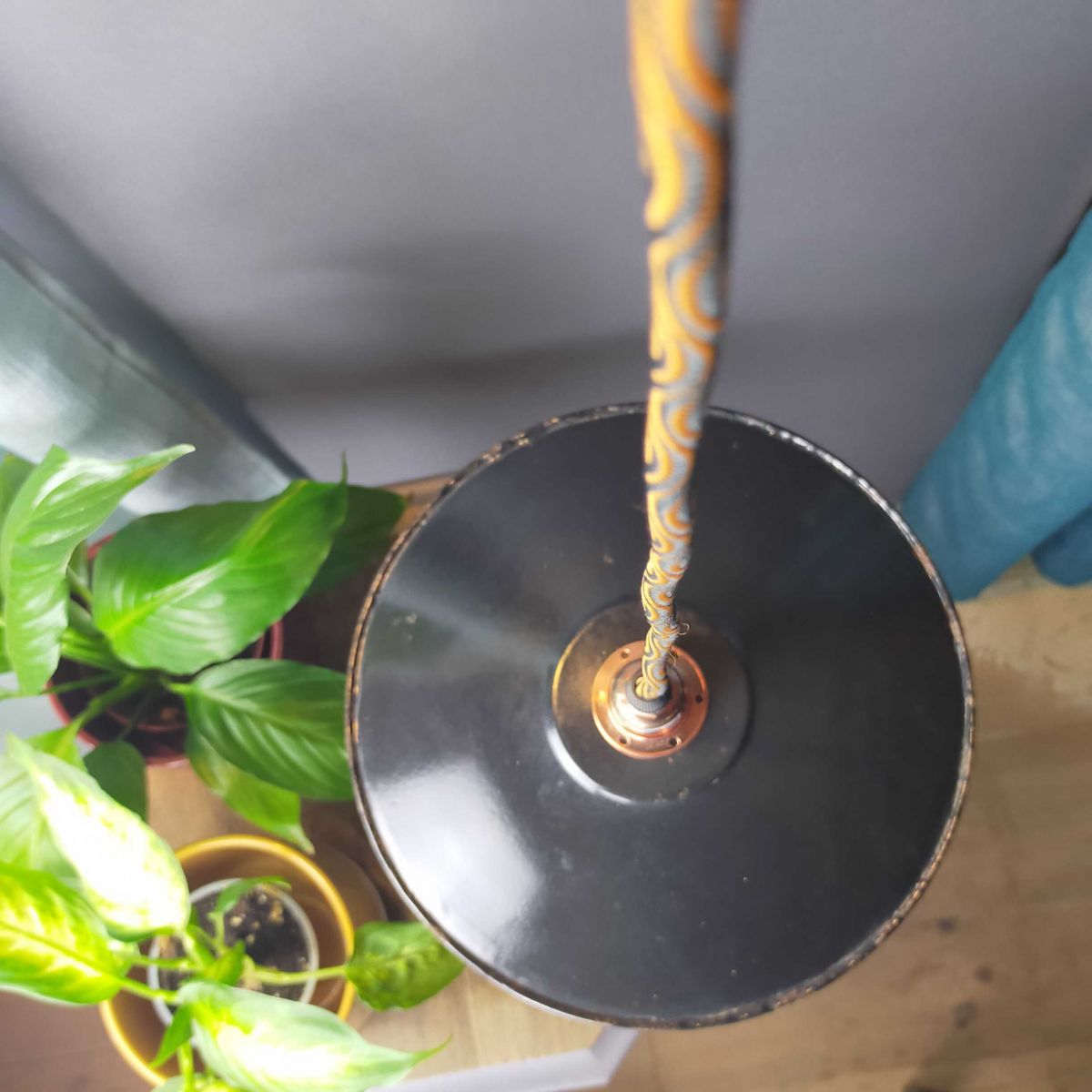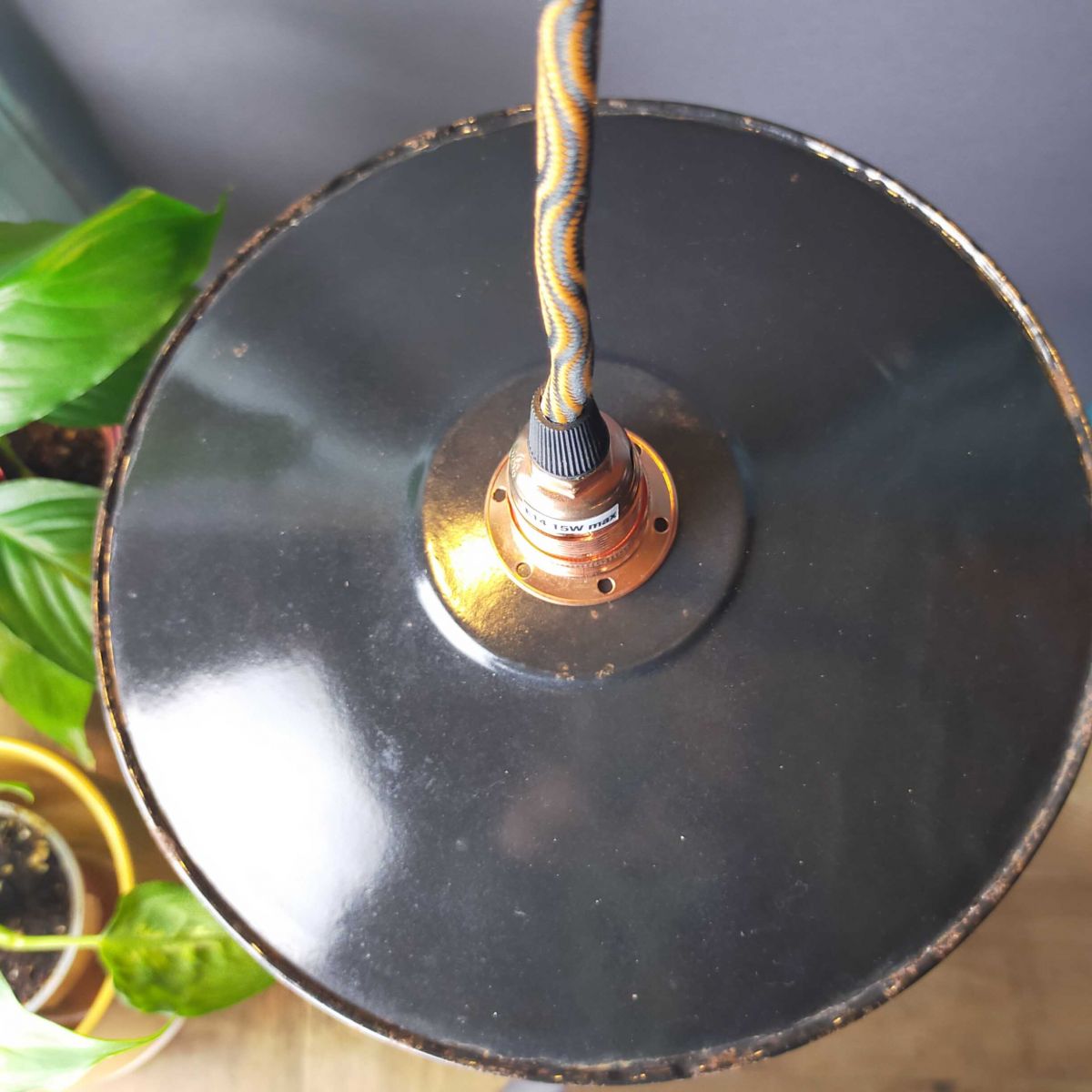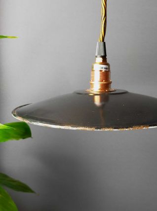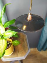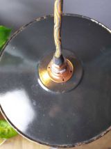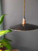 Suspension de plafond réalisée avec un ancien abat-jour en tôle émaillée de couleur noire à l'extérieur et blanc à l'intérieur pour une meilleure réflexion de la lumière. L'électrification est neuve, réalisée dans nos ateliers. Luminaire réf 0322.03-1 lot 06/2022. Caractéristiques: • câble: rond motif noir optique et cuivre vertigo brillant longueur 104 cm, trois brins. • poids: 385 g. • douille: métal finition cuivrée e 14. • classe isolation: classe i, luminaire avec une isolation principale reliée à la terre. • rosace métal, noire, ø 8cm, fixation par étrier, raccord terre. • raccordement électrique par dominos à levier. • puissance: 15 w max.