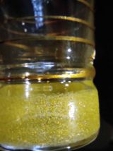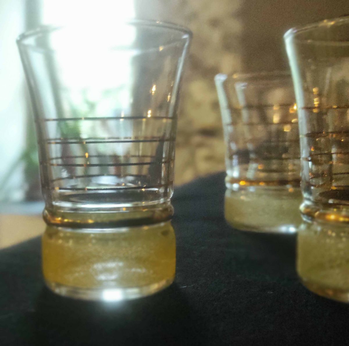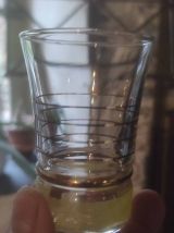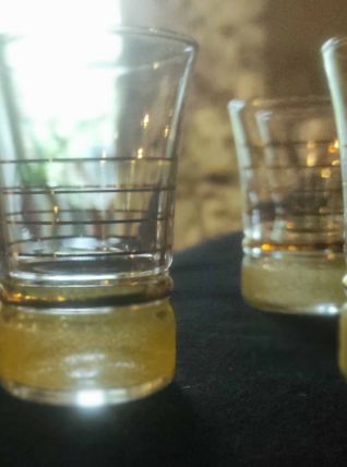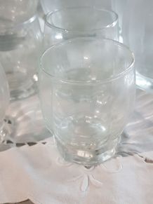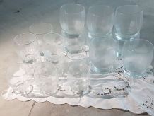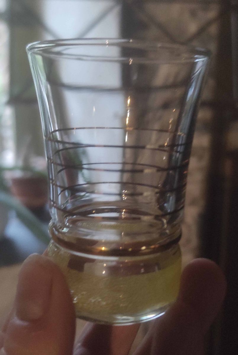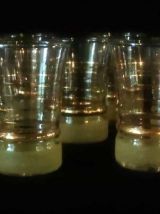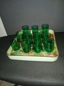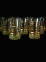 Lot de douze verres granités des années cinquante. Le bandeau granité est d'un beau vert acidulé. Très bon état général. Seul un verre comporte un liseret doré un peu effacé par endroit ( voir photo), tous les autres sont en parfait état, ce qui est exceptionnel compte tenu de la fragilité des peintures dorées sur les verres de cette période. Aucune trace d'usure.