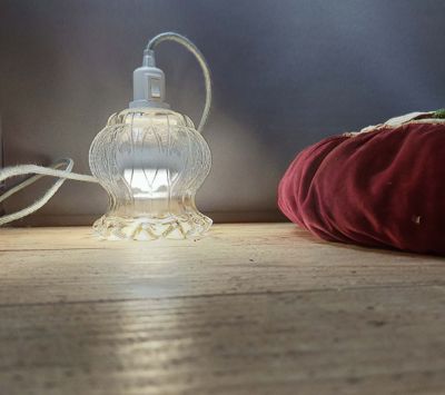 D’une apparence si simple avec un bulbe moulé de mandorles, cette lampe une fois allumée resplendit d’un sublime effet rayonnant. Totalement bluffant ! Une lampe qui cache bien son jeu ….de lumière. Caractéristiques: • ref 1122.06 lot 11-2022. • dimensions: 13 cm de diamètre, 21 cm de hauteur. • douille-interrupteur thermoplastique blanc e27| • longueur du câble 1, 40 m. • poids: 0, 700 kg| • câble rond: bleu-gris effet soie| • fiche blanche. • classe isolation: classe ii, luminaire avec double isolation| • puissance: 5 w max