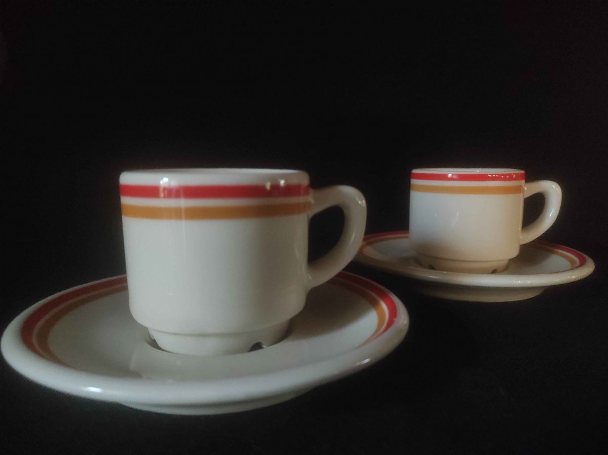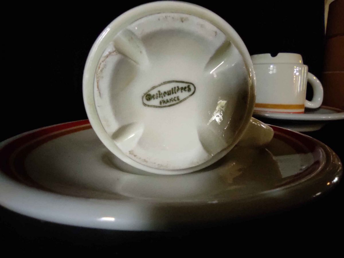56 tasses de bistrot. Deux blanches avec liserets et soucoupe, 3 marron sans soucoupe. Esprit vintage garanti.