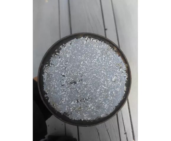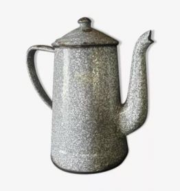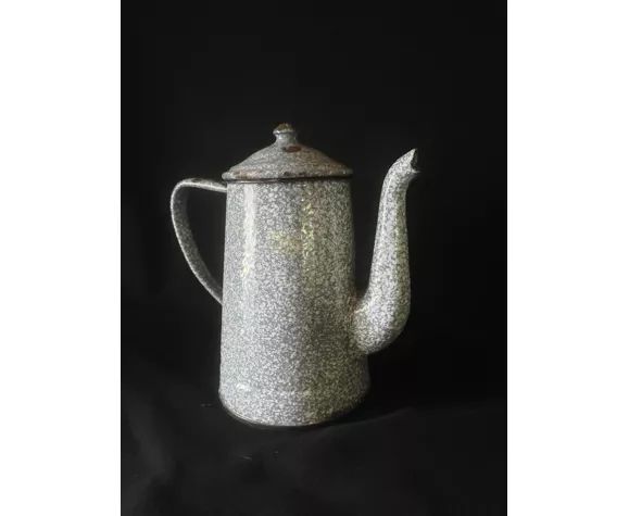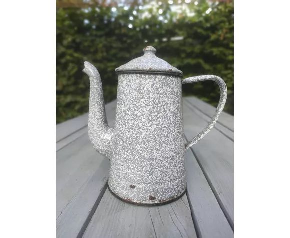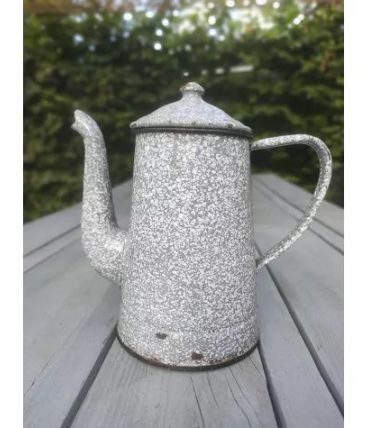 Cafetière en tôle émaillée. Couleur gris chiné blanc. Elle a vécu et possède quelques traces de sa vie passée. Nous prenons quelques vacances. Vous pouvez poursuivre vos achats dans notre boutique.