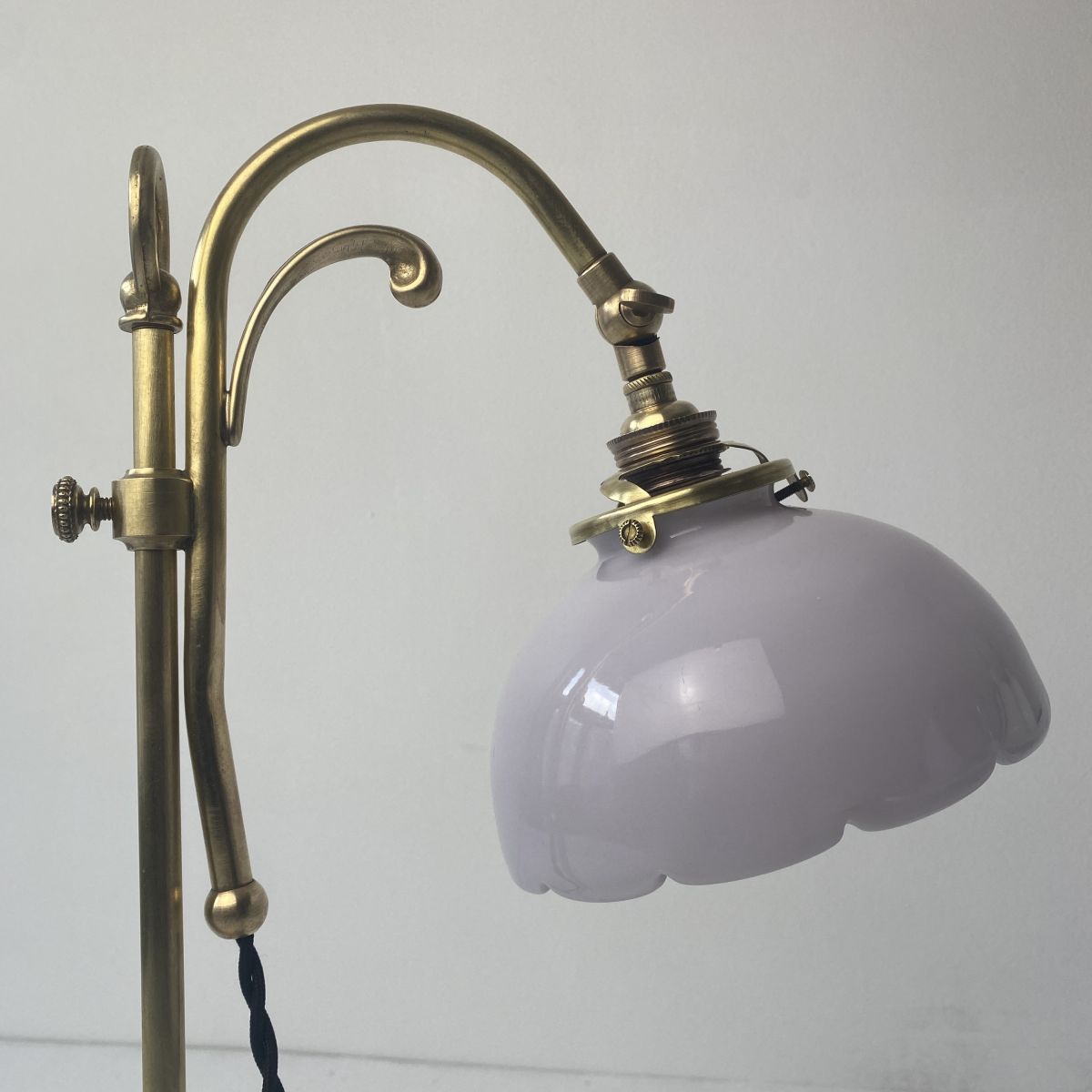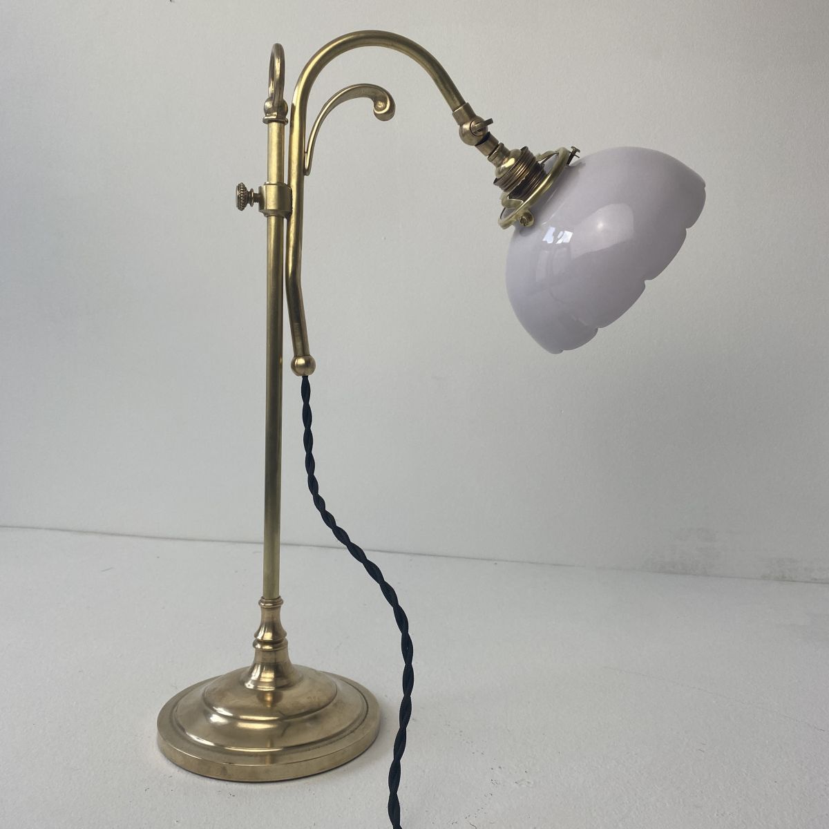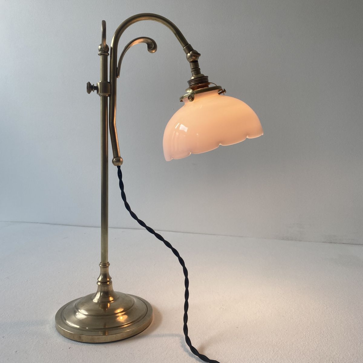 Ancienne lampe de bureau dîte “monte et baisse” des années 1940 en laiton et opaline. L’abat-jour est articulé. Belle lumière.