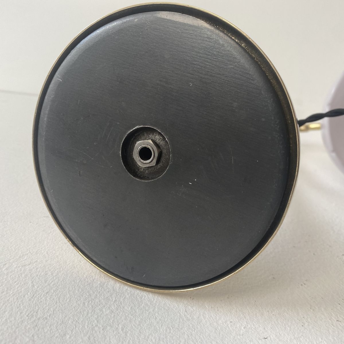 Très bel état général pour cette lampe qui a été démontée entièrement poncée. Electricité refaite à neuf avec fil noir en tissu tressé. Interrupteur zeppelin et douille à baïonnette en laiton (ampoule B22).