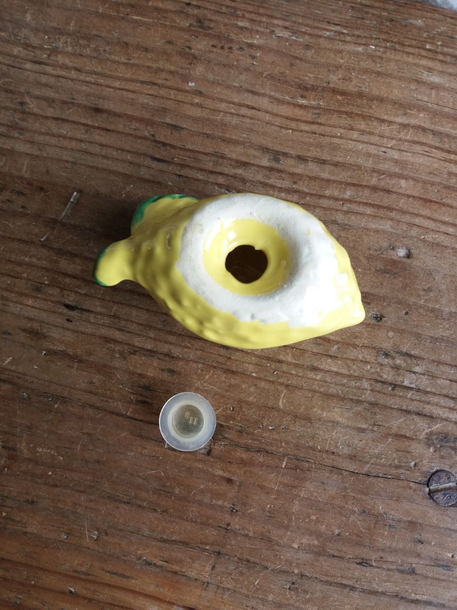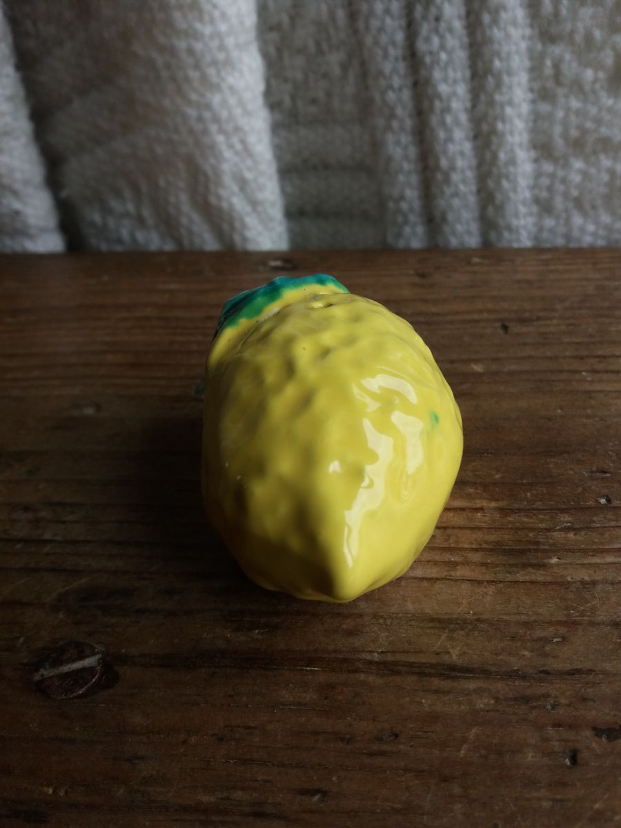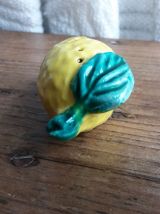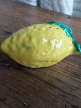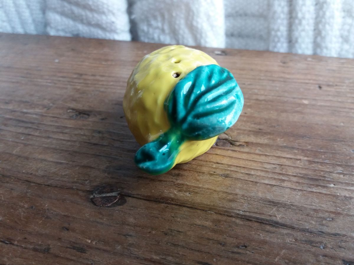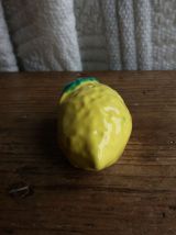 Charmante salière ou poivrier en céramique en forme de citron. Elle est en bon état, pas de fêle, le bouchon est fonctionnel. A noter de petites taches vertes sur le jaune, d’origine. Et le bord de la feuille semble un peu plus rugueux, peut-être une réparation...mais je ne crois pas, il me semble plutôt que c’est d’origine. Il mesure 8 cm de longueur, 4, 5 cm de largeur et pèse environ 50g.
