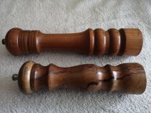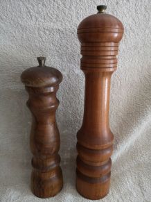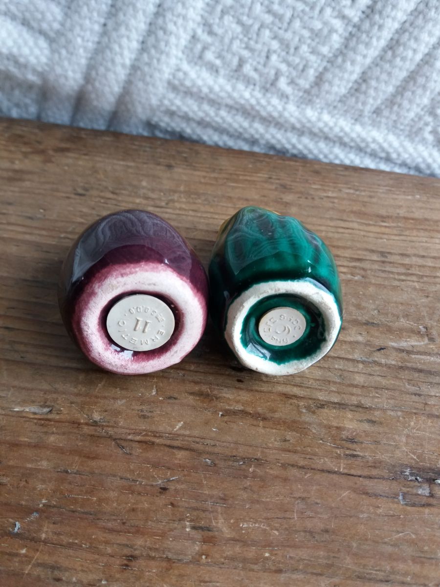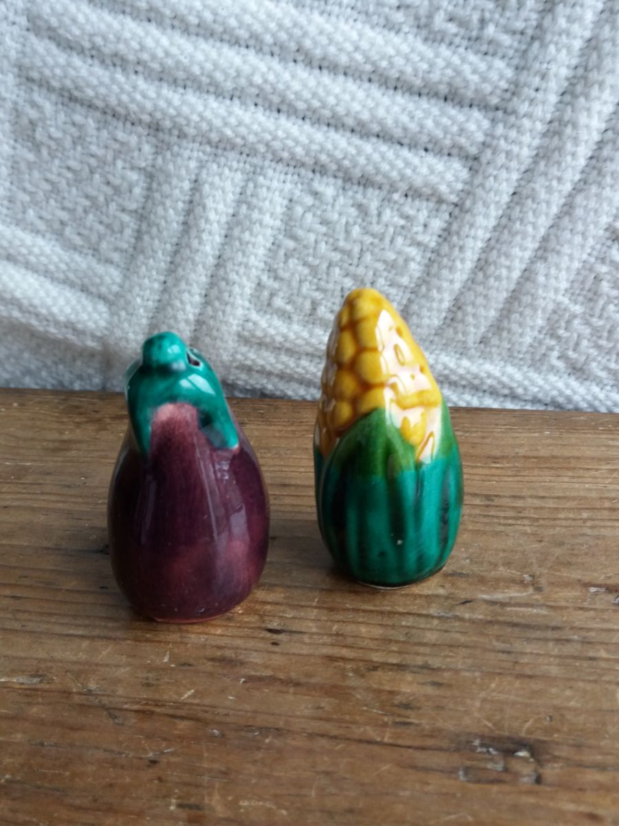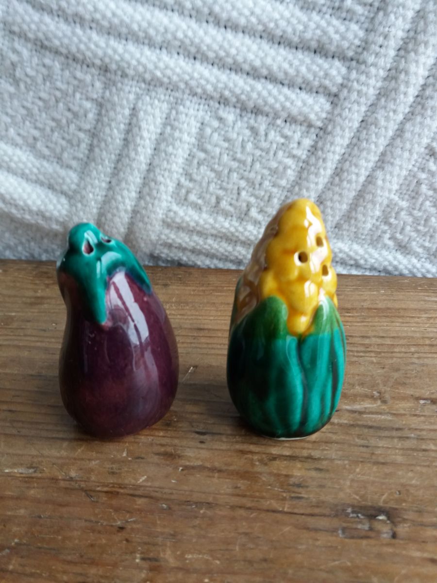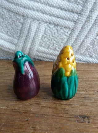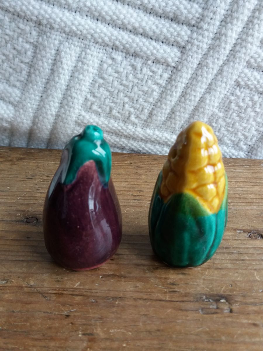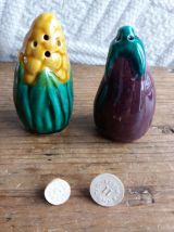 Adorable duo de salière et poivrier en barbotine en forme d’épi de maïs et d’aubergine, ce qui est plutôt original. Sur le bouchon, la mention SGDG indique qu’ils datent d’avant 1968 car cette mention n’est plus utilisée depuis cette année là. L’un comporte trois trous, l’autre quatre. Ils sont en très bon état, ni fêle, ni éclat, ni même une égrenure, les bouchons en caoutchouc sont fonctionnels. Ils mesurent environ 7 cm de hauteur et 4 cm de diamètre.