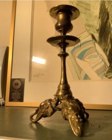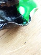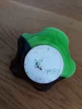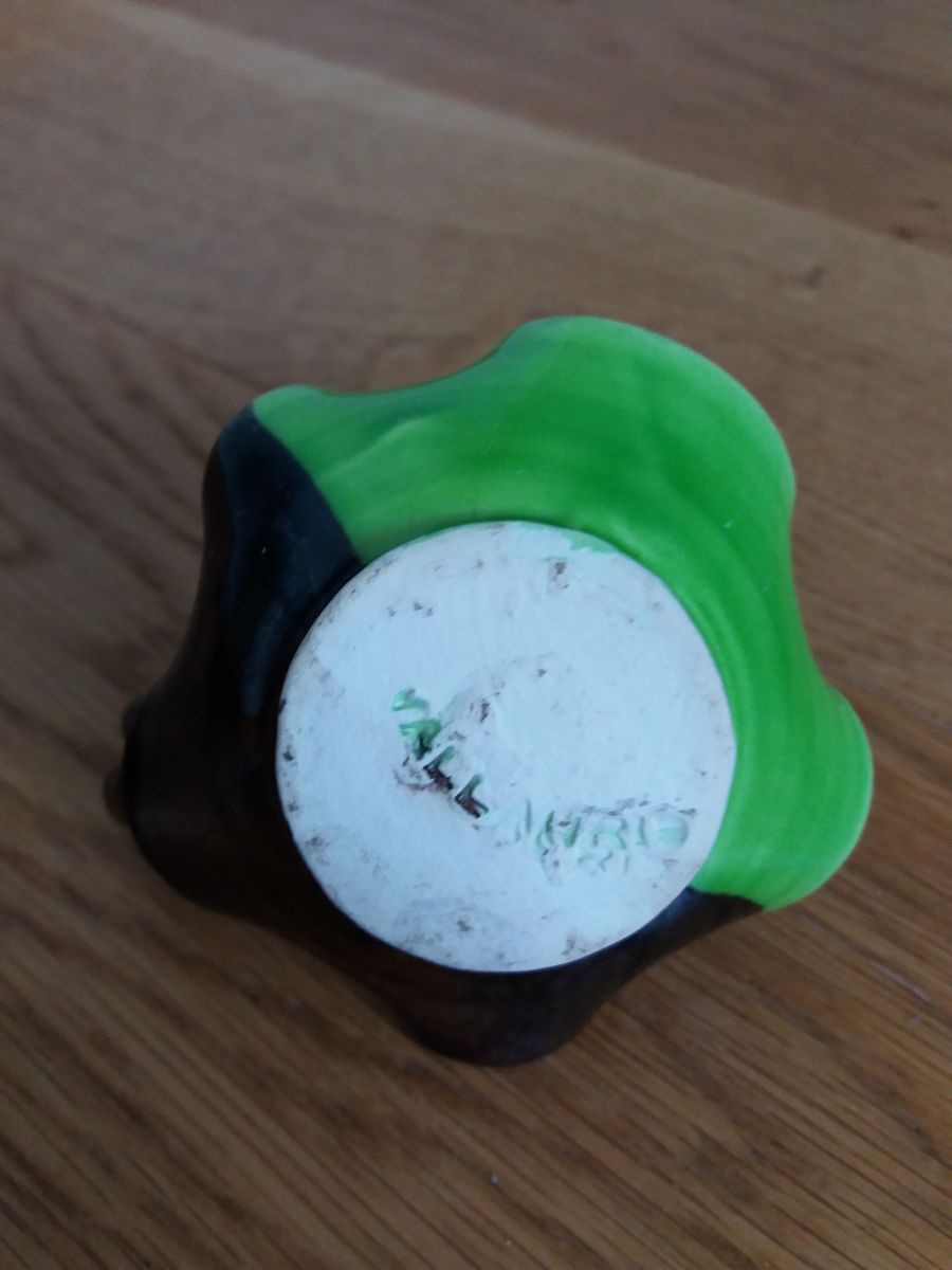 Charmant petit bougeoir en céramique émaillée qu’on appelle rat de cave car il comporte une coupelle pour recueillir la cire et une petite poignée permettant ainsi de s’éclairer en se déplaçant, et notamment à la cave. Il est bicolore, un marron très foncé, presque noir, légèrement irisé et un joli vert tendre, vert laitue (un peu différent du vert rendu par les photos, l’avant dernière photo prise sur un meuble rend mieux la couleur). Il est estampillé Vallauris dessous et date probablement des années 60. Il est en bon état général, pas de fêle, juste une petite égrenure sur le bord et un éclat (la tache foncé dans la zone verte, sur le bord de la coupelle), que j’ai d’abord pris simplement pour un débordement d’ émaillage noir sur le vert, mais qui au toucher laisse sentir un manque...probablement un masquage suite à un accident. Les deux défauts sont visibles sur la dernière photo, en gros plan. Il mesure 9 cm de longueur, 8 cm de largeur, 5, 5 cm de hauteur, le diamètre de la partie ou l’on insère la bougie mesure 2, 2 cm.