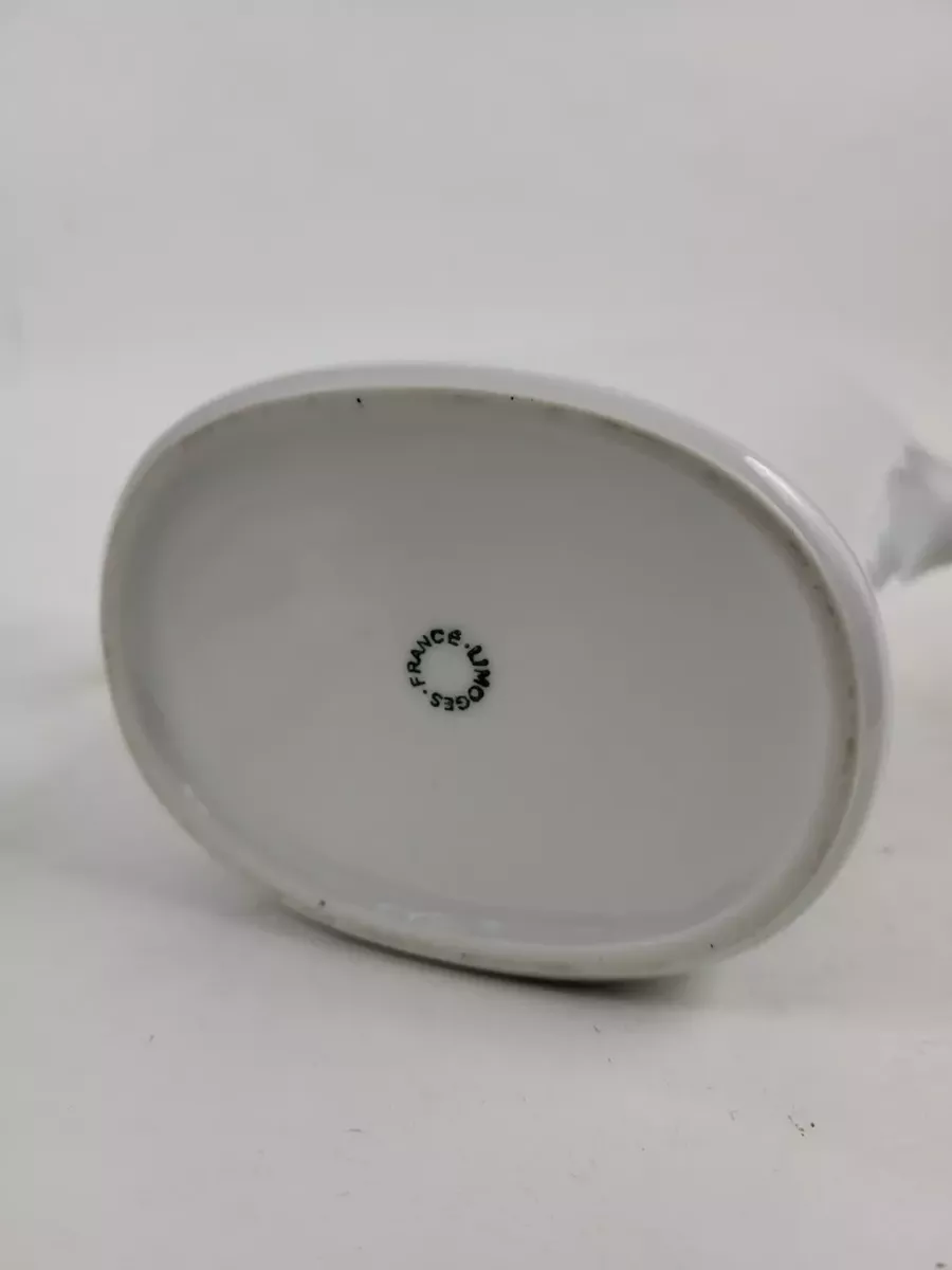 Ensemble cafetière et 6 tasses en porcelaine. Cafetière en porcelaine de limoges. Le tout en bon état, avec traces d'usage habituelles. Hauteur cafetière 18 cm. Hauteur tasses 6 cm.