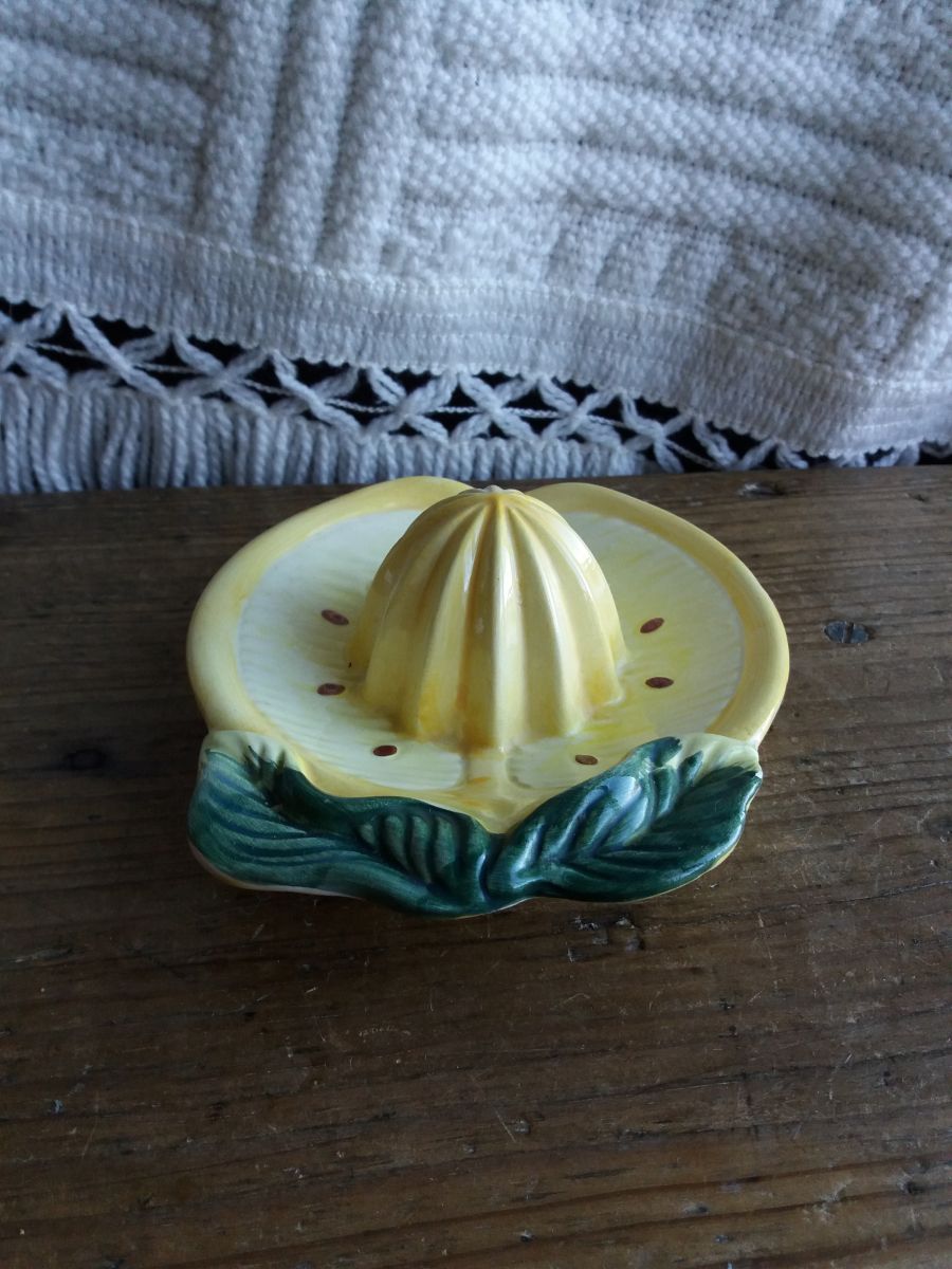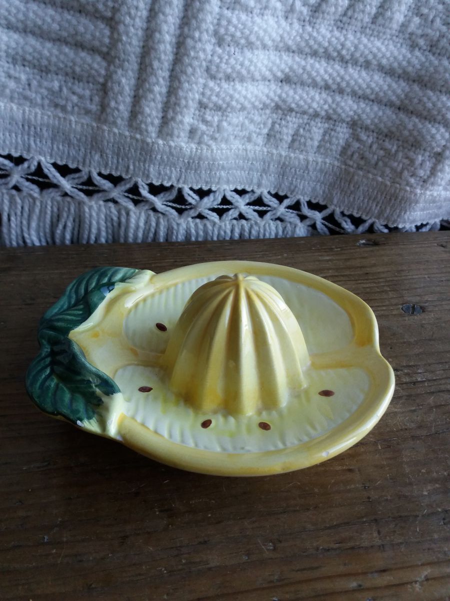 Charmant presse agrume en céramique peinte, en forme de citron, qui mettra du soleil dans votre cuisine ! Il est de couleur jaune pâle et vert. Souvent ces objets étaient fabriqués au Portugal, mais pour celui-ci je n’ai pas d’indice sur sa provenance ou son âge. Il est en bon état général, pas de fêle mais 4 ou 5 petites égrenures quasiment invisibles sur l’émaillage. Il mesure 14 cm de longueur, 13 cm de largeur, 5, 5 cm de hauteur.