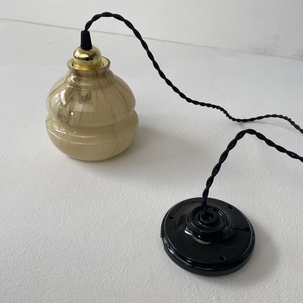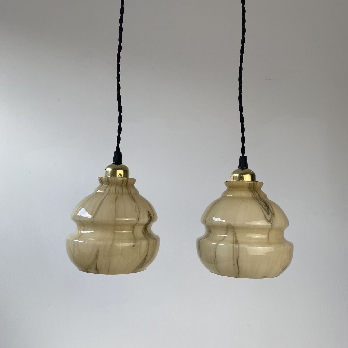 2 suspensions avec effet marbré. La lumière est belle. Années 1950. En très bel état.