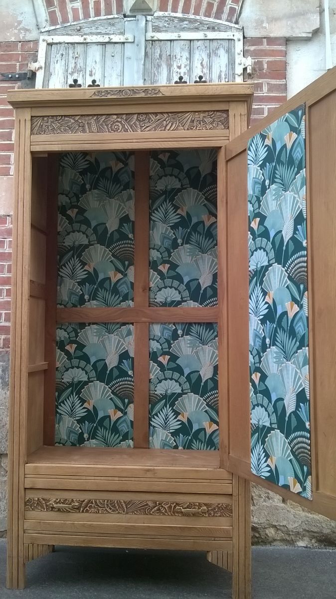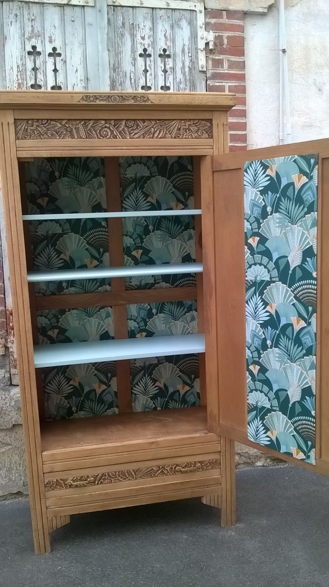 Armoire parisienne brut année 30. Elle a été poncée et laissée en bois brut. L'intérieur de l'armoire et du tiroir a été tapissé d'un papier art déco.
