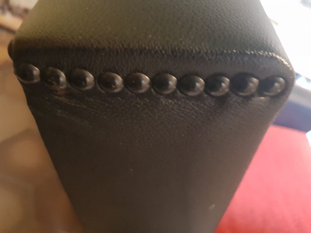 Assise en tissu bouclette de couleur rouge . Accoudoirs en skaï noir fixé par des clous .