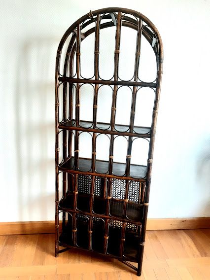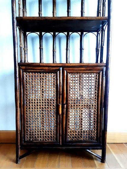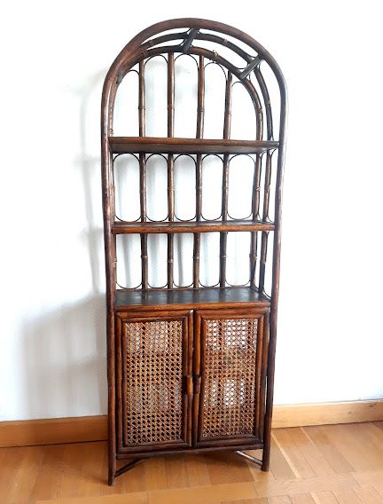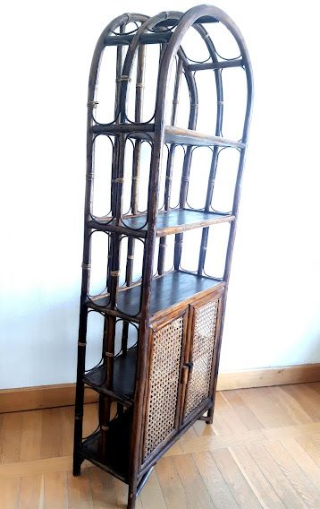 Grande bibliothèque en rotin, travail vintage vers 1960 / 1970