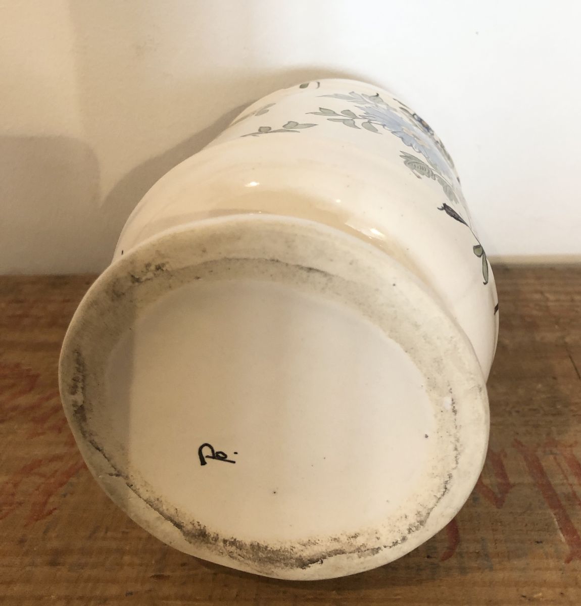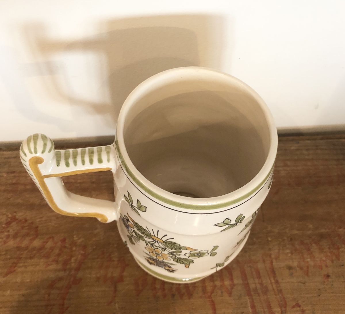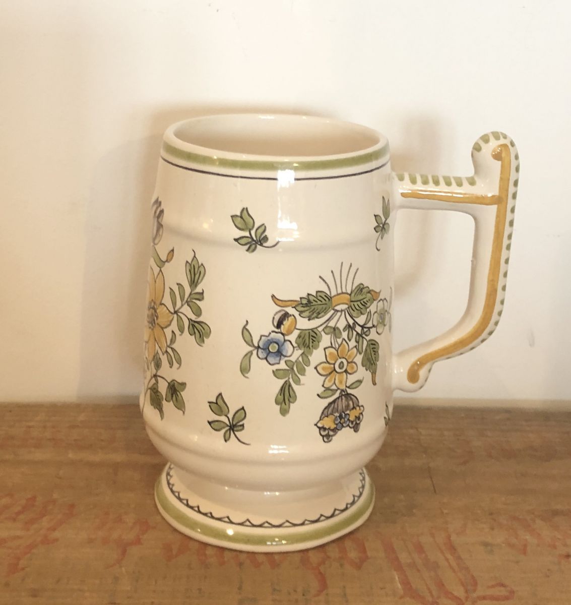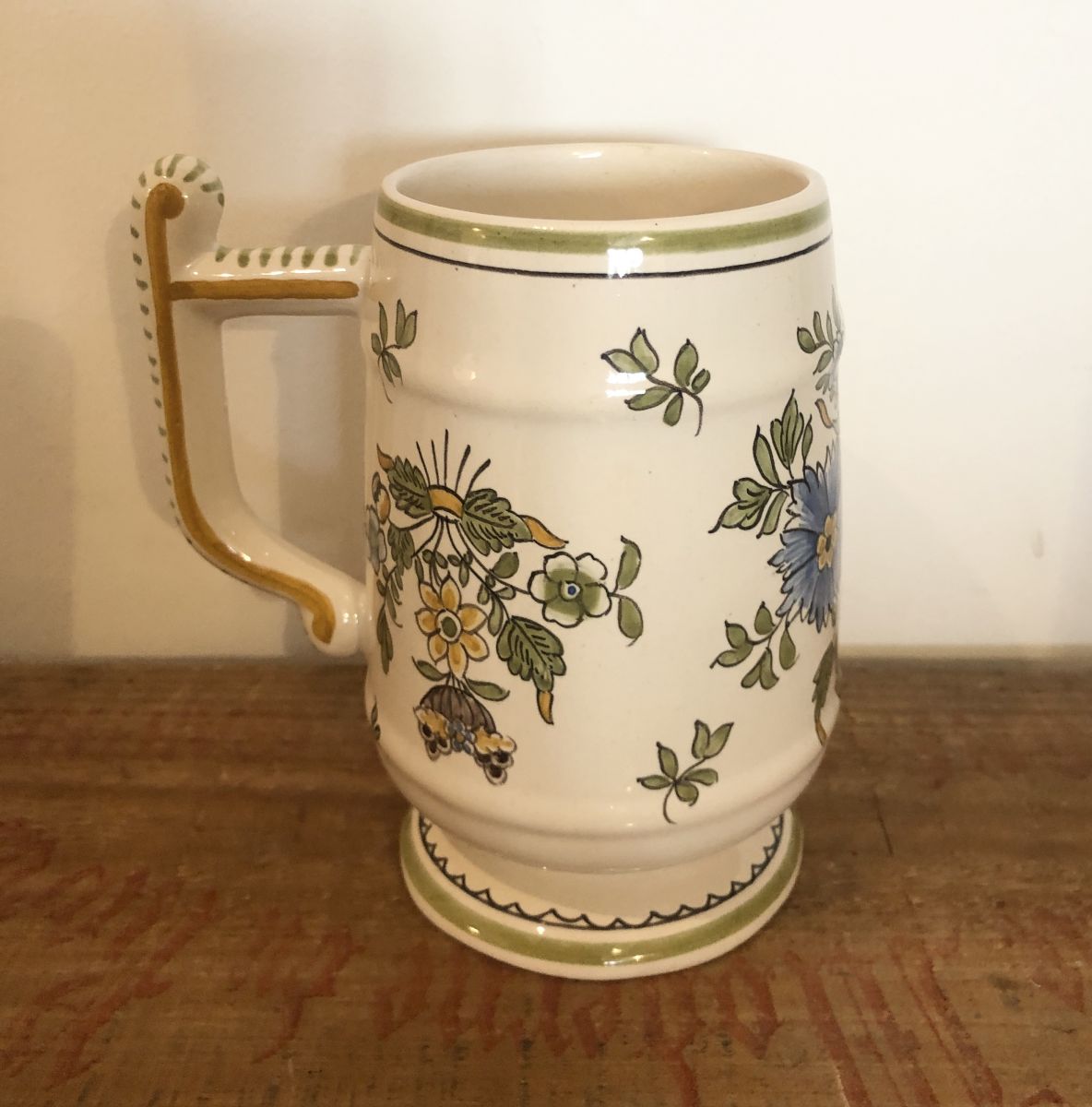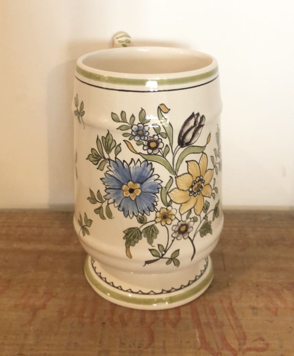 Verre à bière Moustiers avec fleurs bleues et jaunes, fait main et signé. 14/7,5 cm +4cm de anse.
