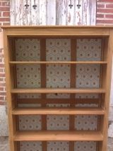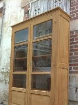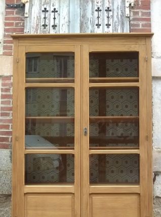 Vitrine parisienne année 50 en chêne. Cette armoire a été poncer et laisser brut. Aménagée de 4 étagère en sapin et chêne. Le fond de l'armoire a été tapissé d'un papier cubique. L'armoire est stable et solide. Hauteur totale 180 cm. Largeur 119 cm. Profondeur extérieur 37 cm. Profondeur intérieur 30 cm.