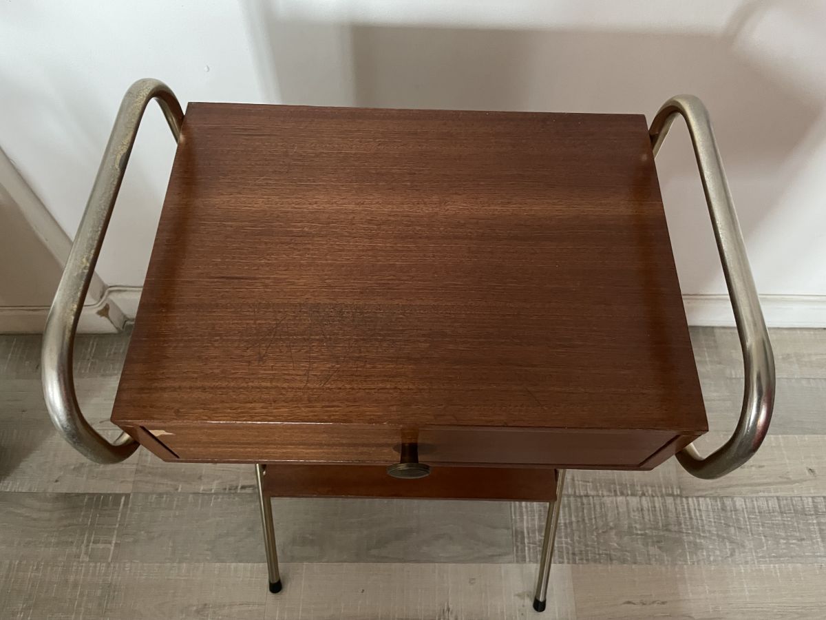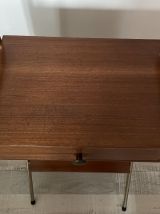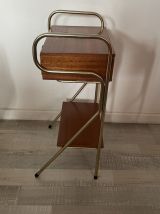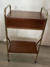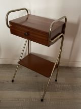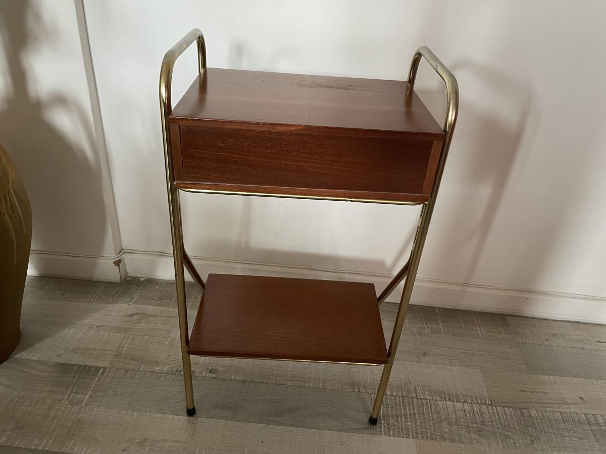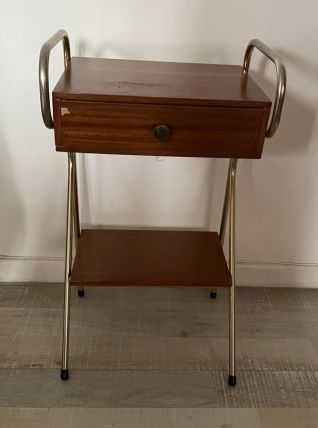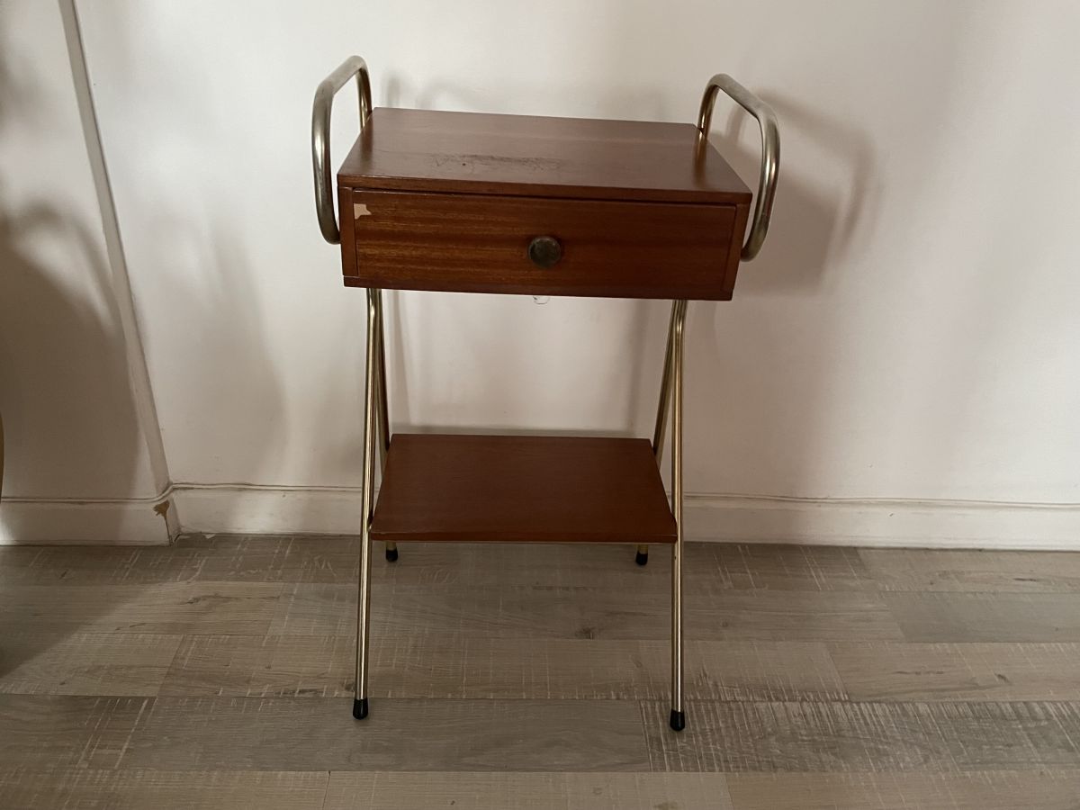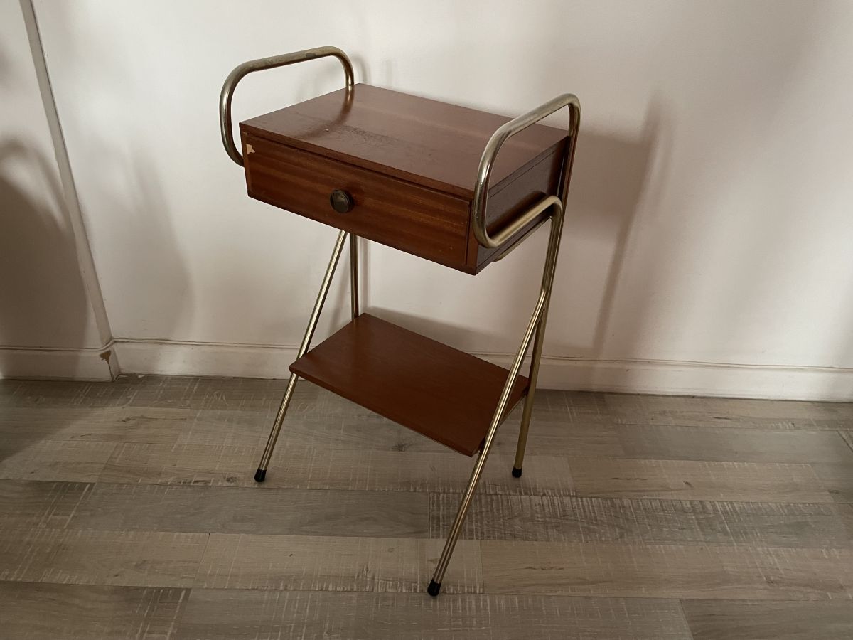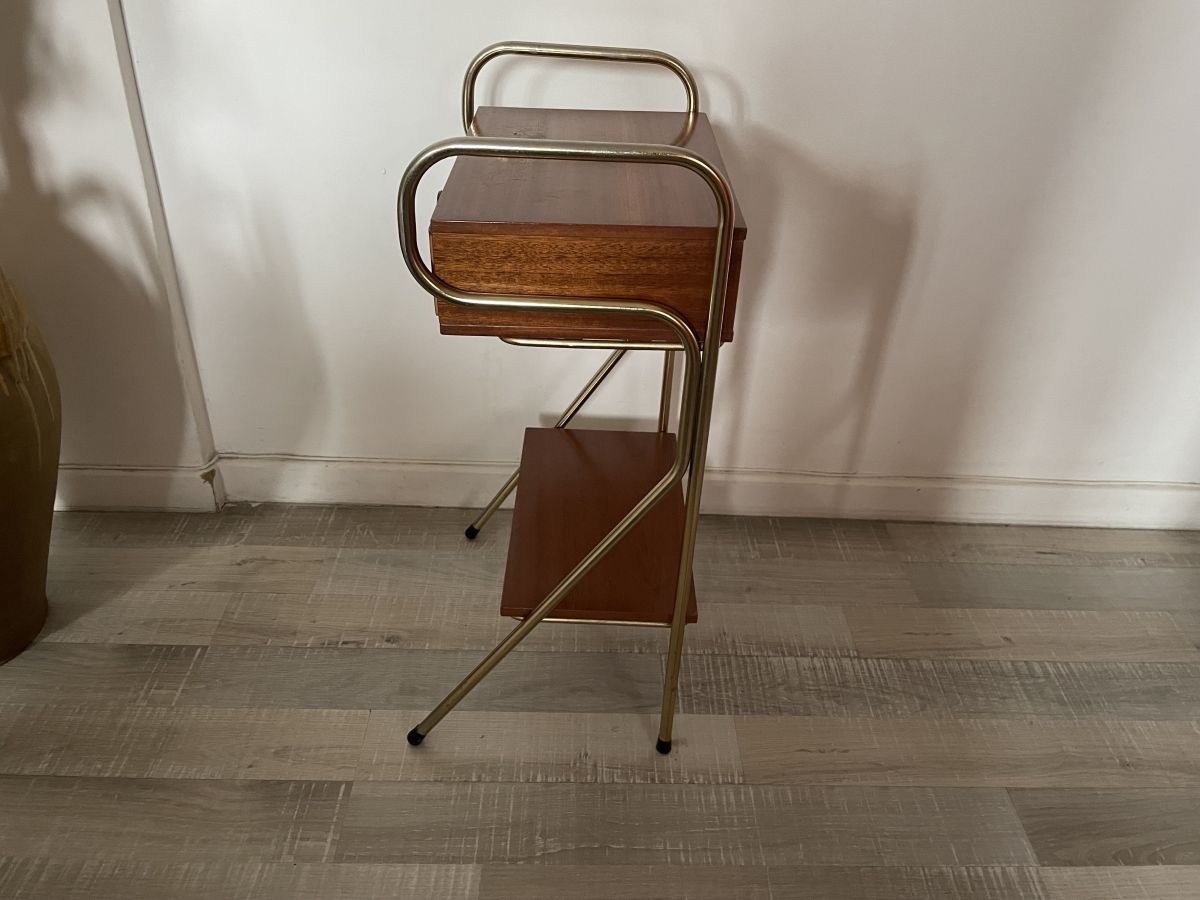 Chevet des années 50 du designer français Jacques Hitier en bois et placage, structure tubulaire en métal doré, 1 tiroir (petit manque sur le coin), quelques traces d’usage et griffures sur le dessus et le plateau (voir photos) absolument sans conséquence sur l’esthétique générale, dimensions (cm) : L.38xH.68xP.30, bon état.