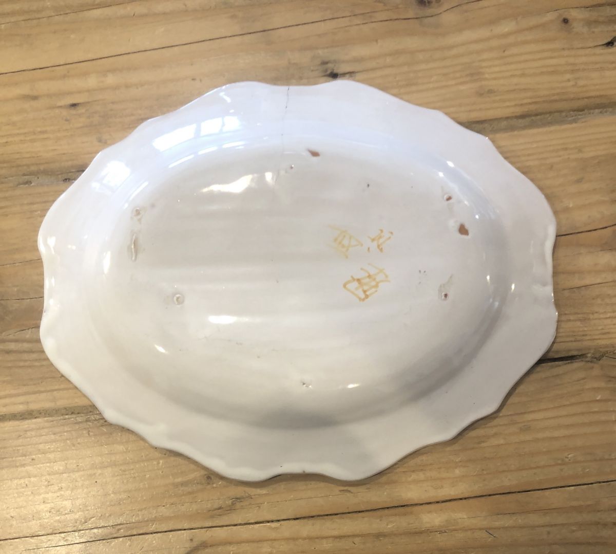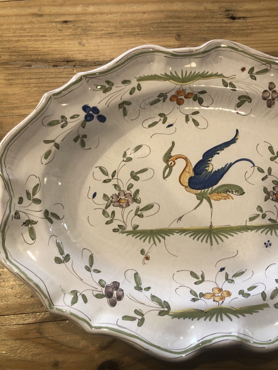 Plat Moustiers signé avec oiseaux bleu et vert, sans éclat.