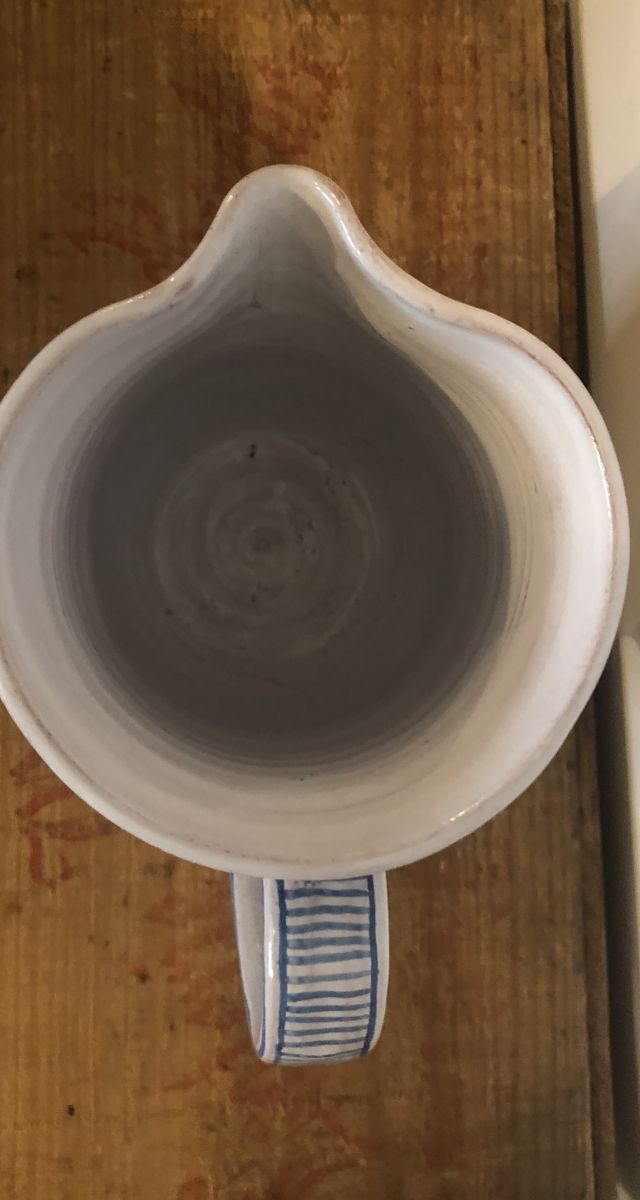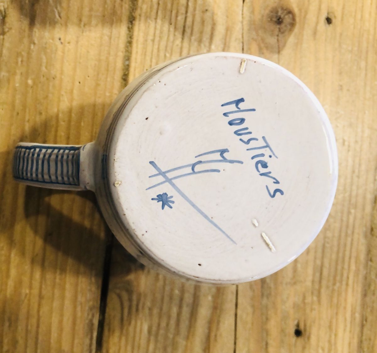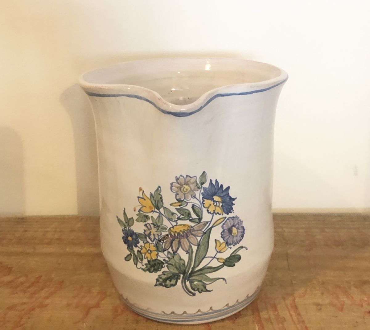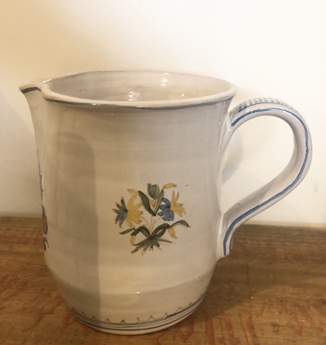 Pot à eau Moustiers fleurs bleues et jaunes signé Moustiers.