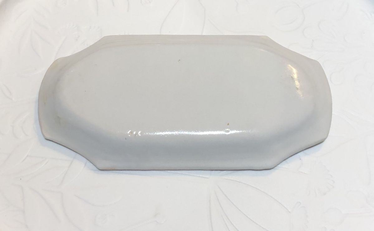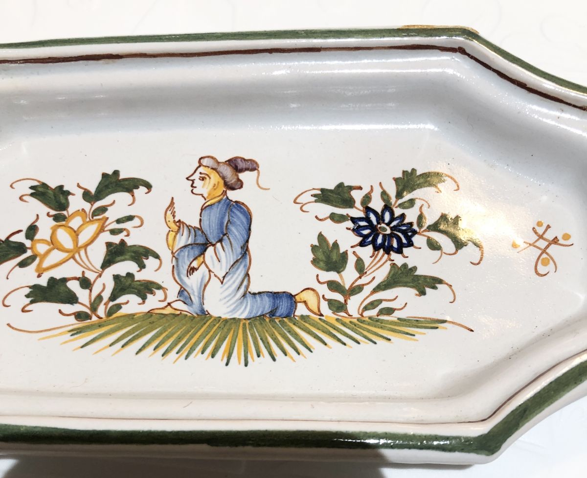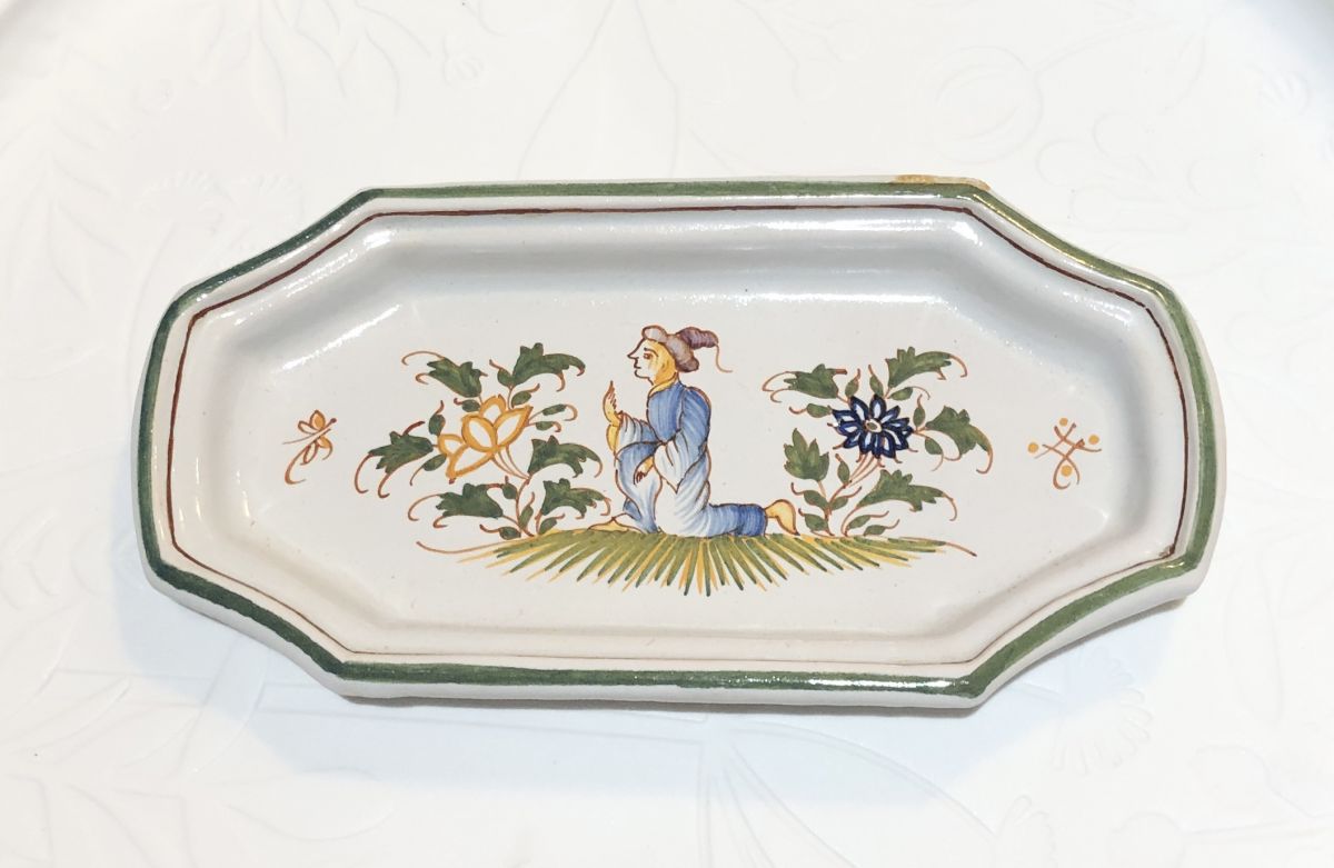 Vide poche Moustiers dessin homme a genoux, fleurs jaunes et bleues 18/9cm et 2 cm.