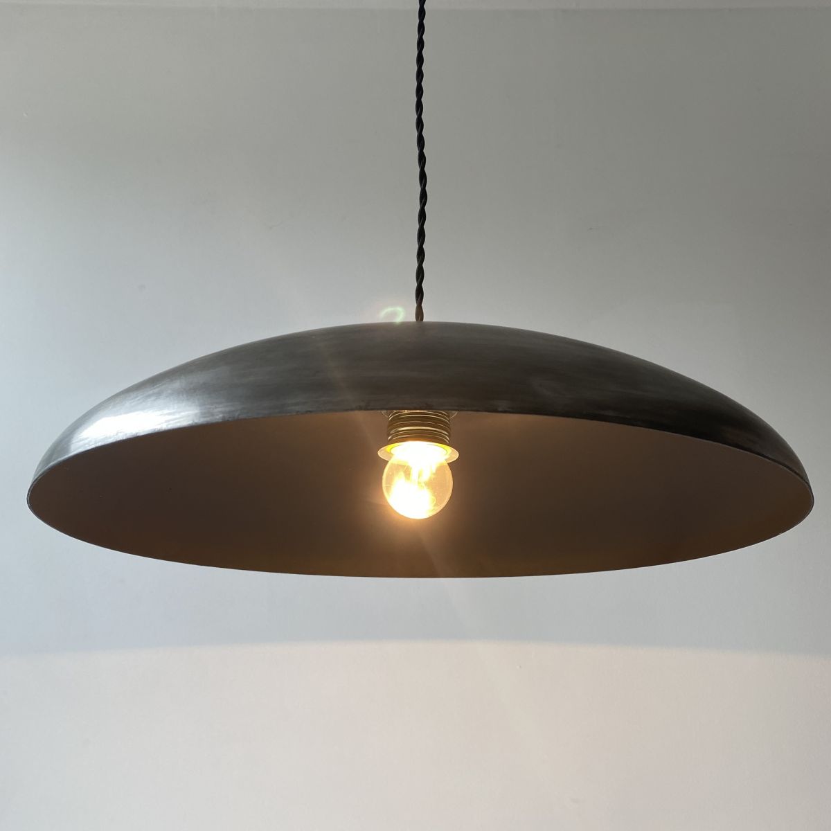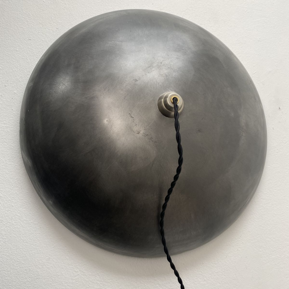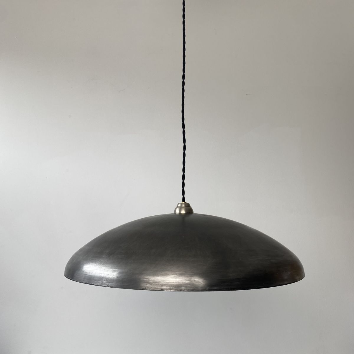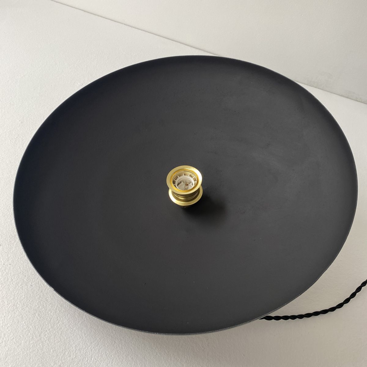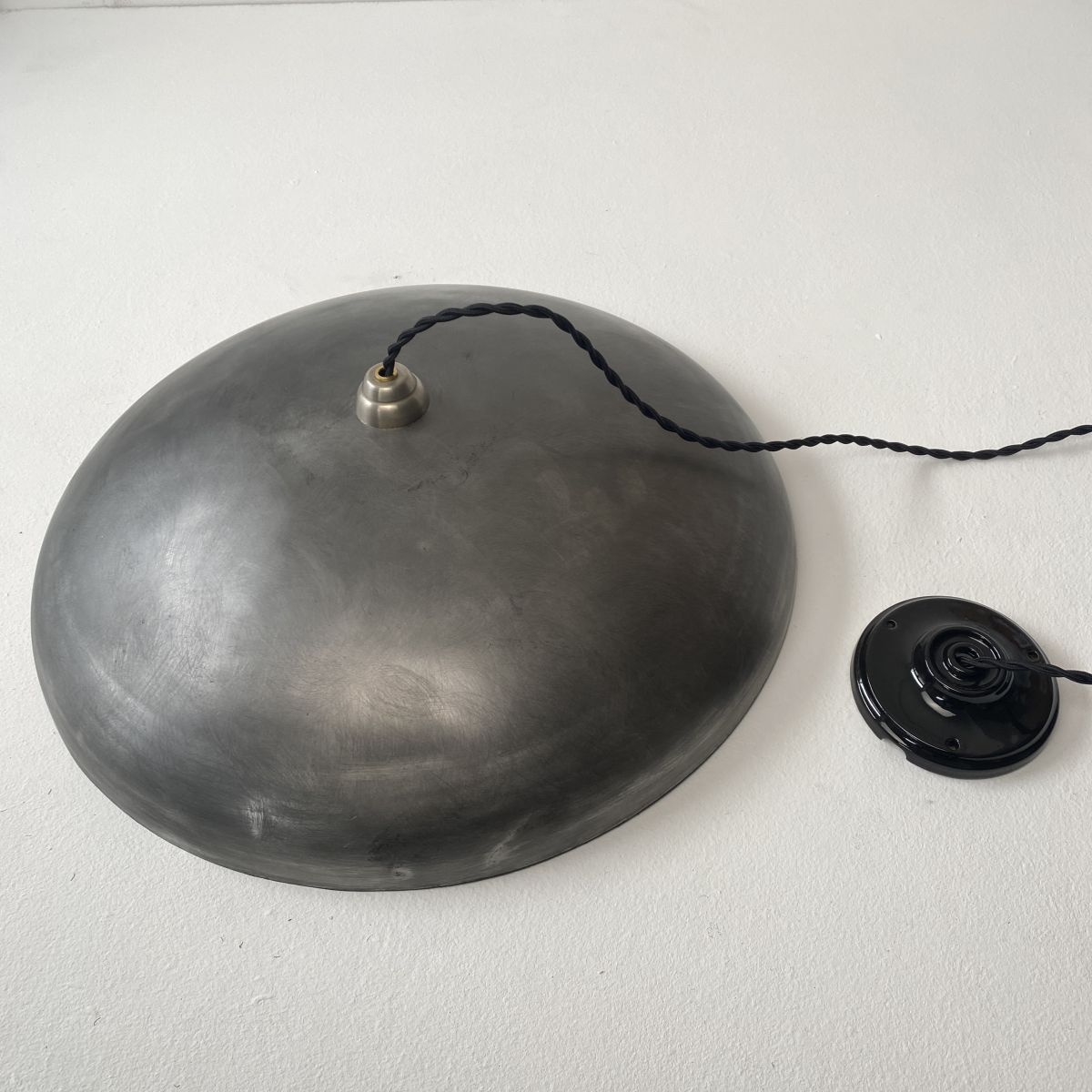 L’abat-jour a été entièrement poncé pour retrouver l’acier. Il a été ensuite patiné ton anthracite sur le dessus et repeint à la peinture noire mat haute température en dessous. Electricité refaite à neuf avec fil en tissu noir torsadé. Branchement par domino. Douille à vis gros culot (E27). Présence d’une rosace de fixation en porcelaine