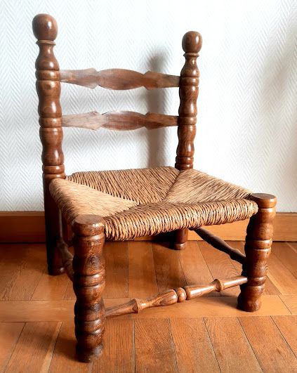 Chaise dite "chaises de cheminée" ou "coin du feu" Art brutaliste. Ce modèle en chêne massif est très confortables avec sa large et solide assise paillée.
