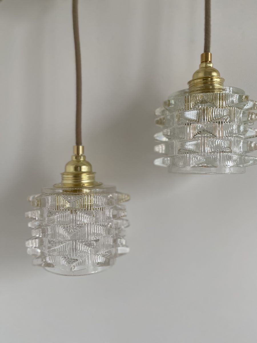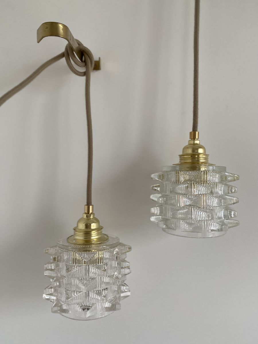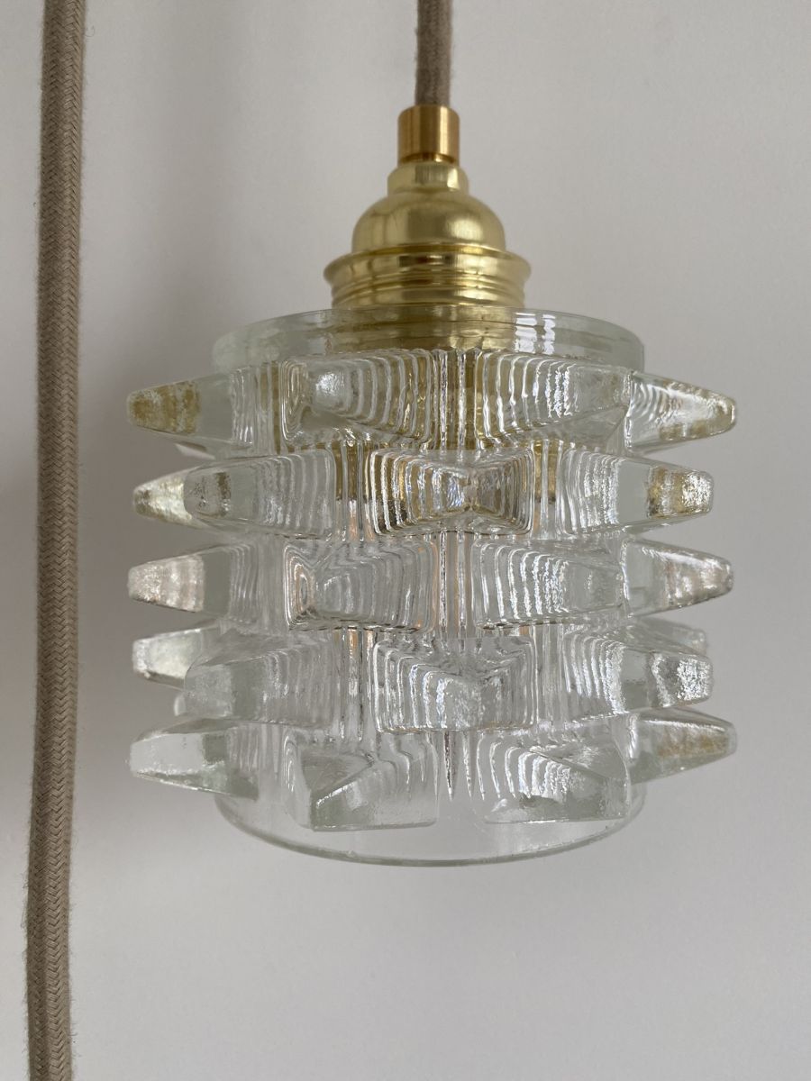 Parfait combo entre les découpes de verre travaillé, le cordon coloris lin, et la douille dorée !